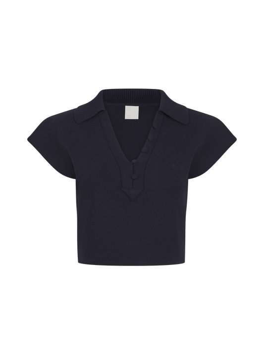 Cropped Knitted Wide Shoulder Top - Navy