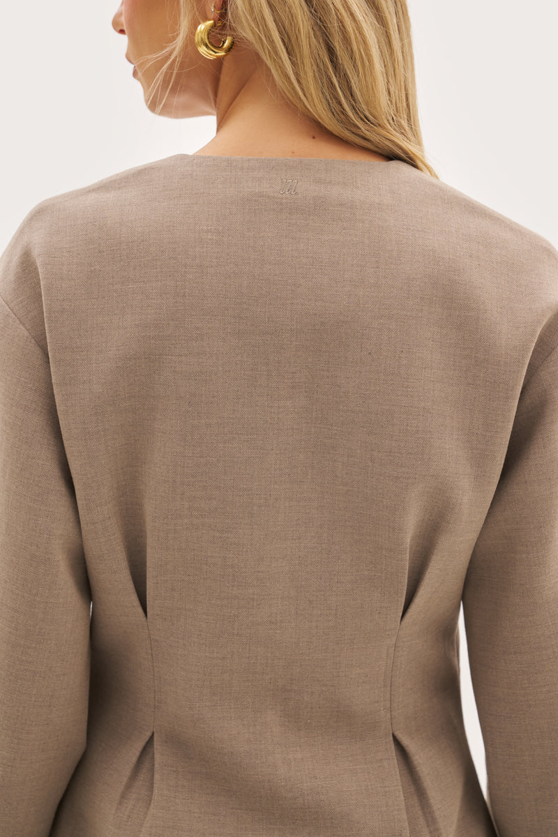 Crafted from a refined blended yarn tailoring fabric, the Alora Balloon Sleeve Blazer in Taupe epitomises understated elegance. The fitted waist is enhanced by a distinctive double dart pleat detail to the back, while the wider hem enhances the shape. A dart pleat detail to the back cuff adds subtle sophistication. The concealed centre front fastening maintains a seamless aesthetic to this longline blazer, whilst full lining provides comfort and structure. Finished with discreet branding at the back neck, this taupe piece is a versatile wardrobe essential.