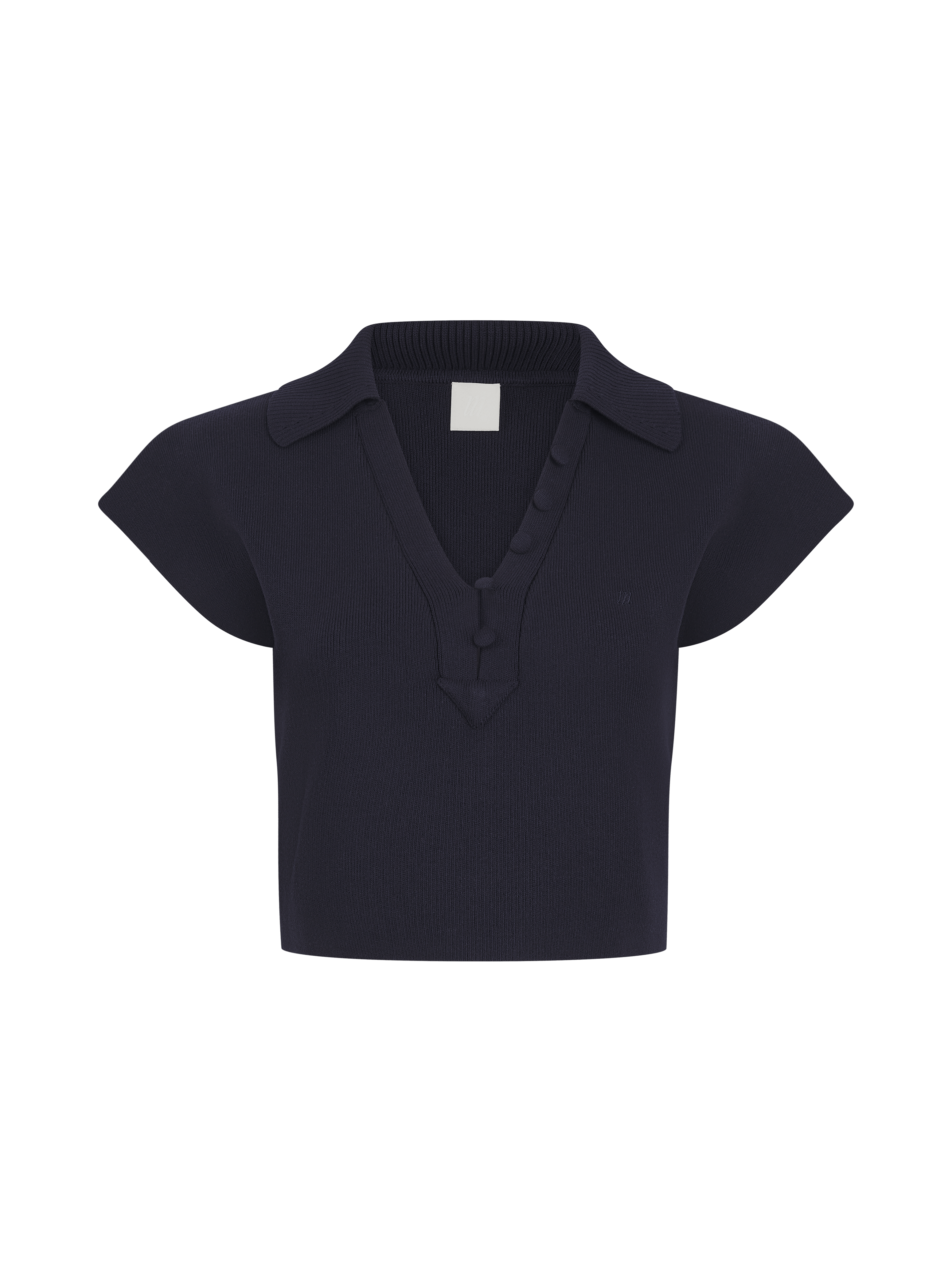 Crafted from a luxurious blended fabric, the Cropped Knitted Wide Shoulder Top in Navy combines contemporary tailoring with refined details to offer both comfort and sophistication. The thick compact knit adds structure while the contrasting textured collar adds modern detailing. A wide-shoulder silhouette and wider base hem are complemented by the cropped length. Decorative front buttons and delicate tonal Maebe embroidery on the chest add understated finishing touches, making this piece a versatile and polished addition to your wardrobe.