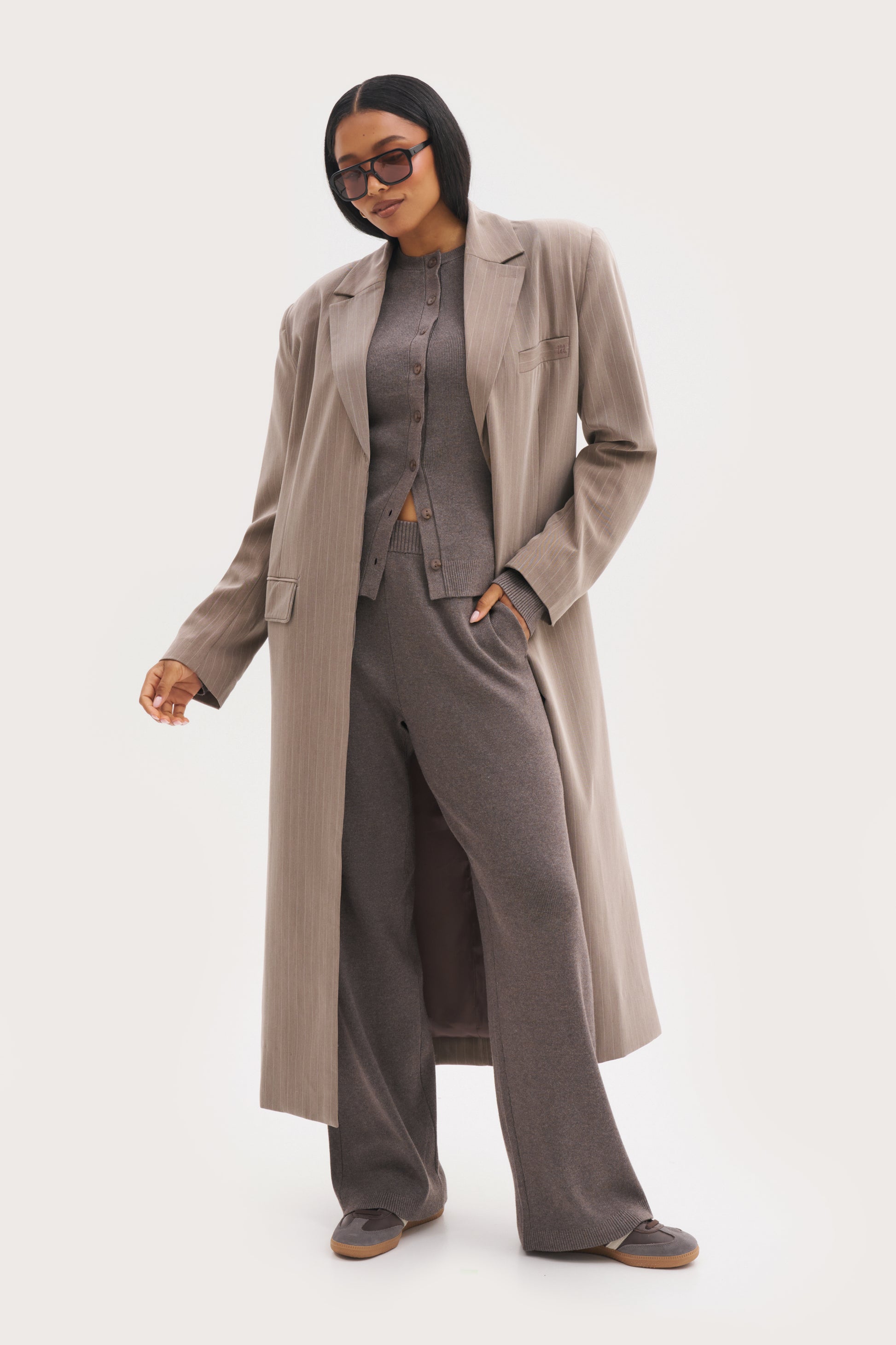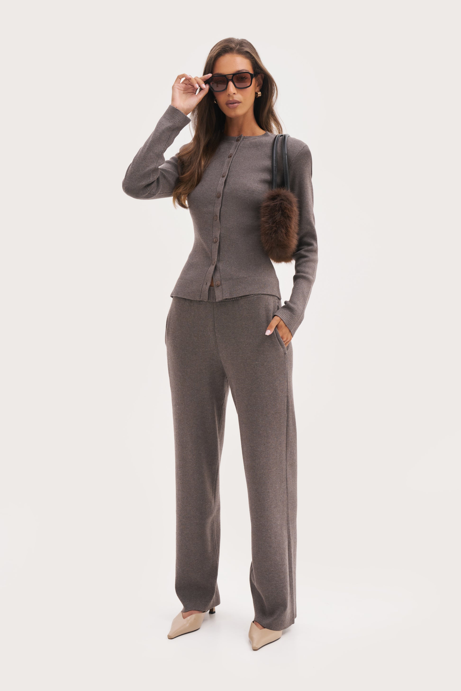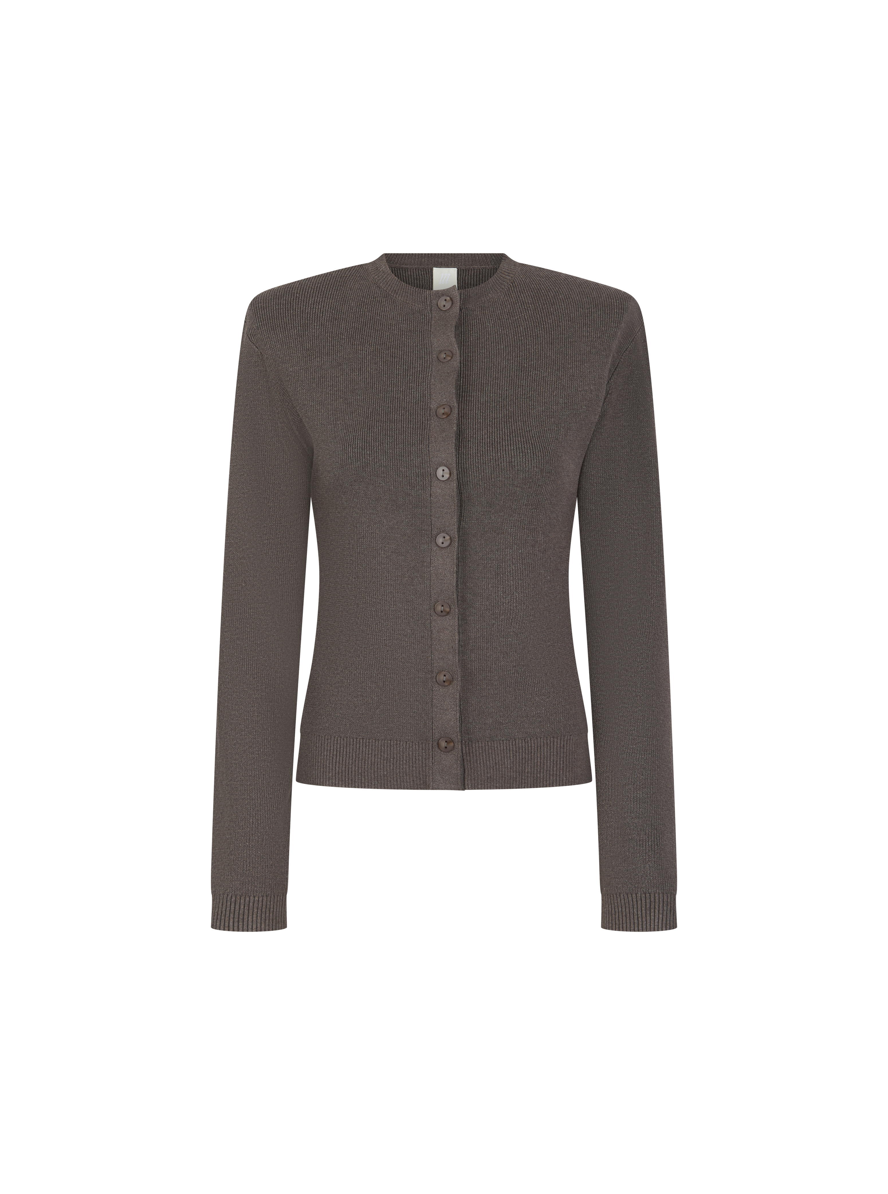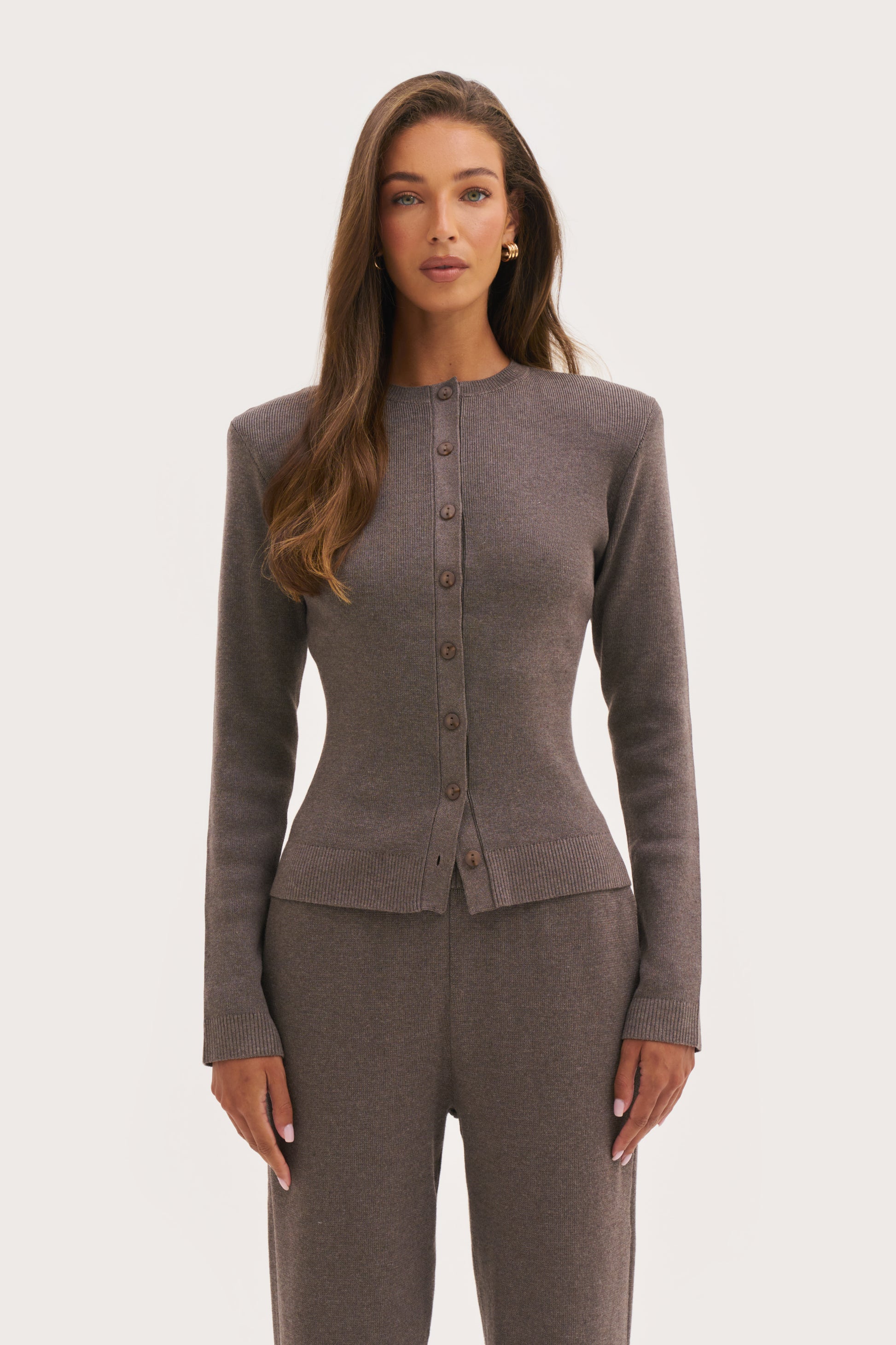 The Retreat Ribbed Knit Top features a medium-weight, super-soft ribbed knit crafted from a blended yarn, balancing comfort with durability. Designed with a tailored cardigan silhouette, it fits closely to the waist while offering relaxed, straight sleeves. The removable deep knit-covered shoulder pads provide versatility in styling, complemented by matte-touch tonal buttons and a subtle Maebe woven label at the back neck, lending a refined finish to this timeless piece.