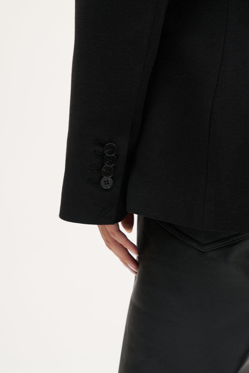 The Tailored Every Wear Blazer features a sleek blended-yarn fabric with a refined hourglass, double-breasted silhouette. The wide shoulders, complemented by internal shoulder pads create a structured, elegant shape, with a fully lined interior for comfort. Designed with jetted flap pockets and a chest welt pocket embroidered with the Maebe logo, it combines detail with sophistication. Finished with marbled matte tonal buttons with subtle yet considered Maebe branding, this blazer is an essential piece for polished, timeless style that can simply be worn in every wear, everywhere.