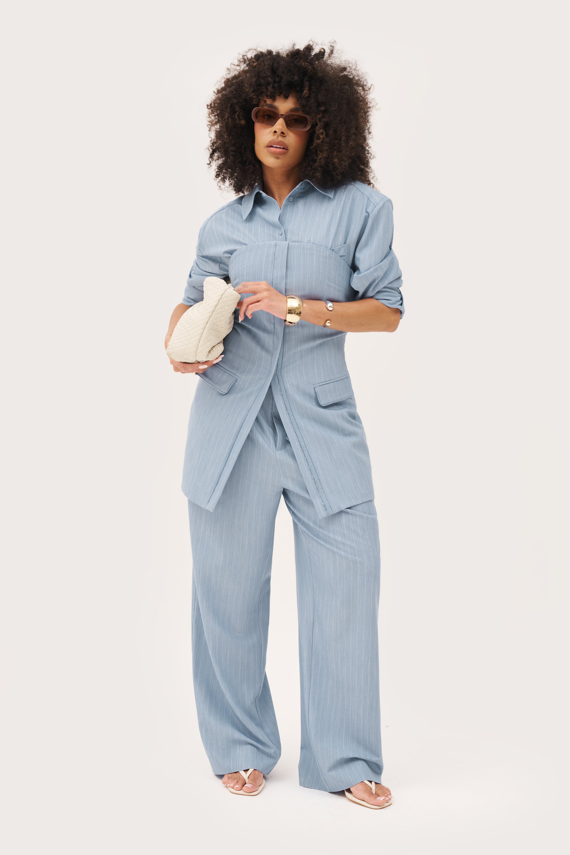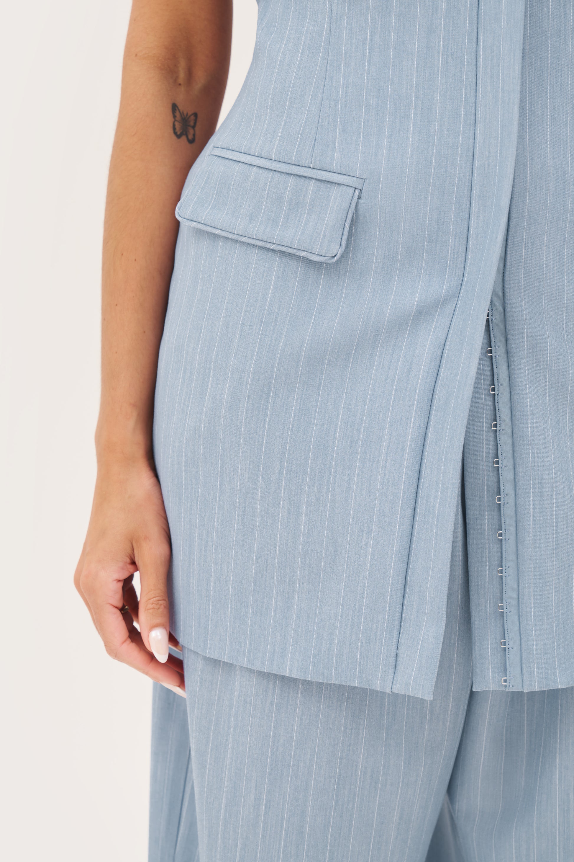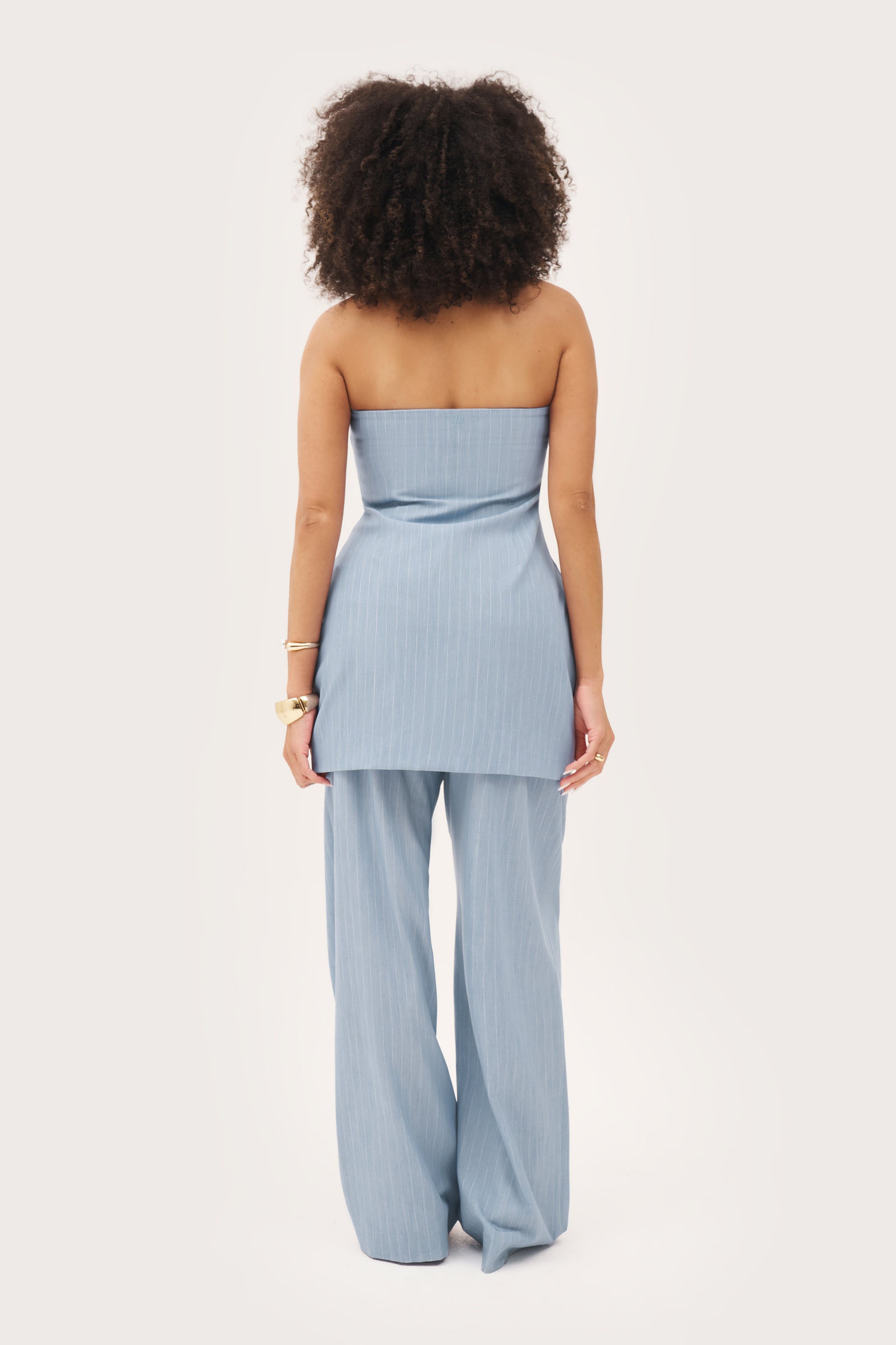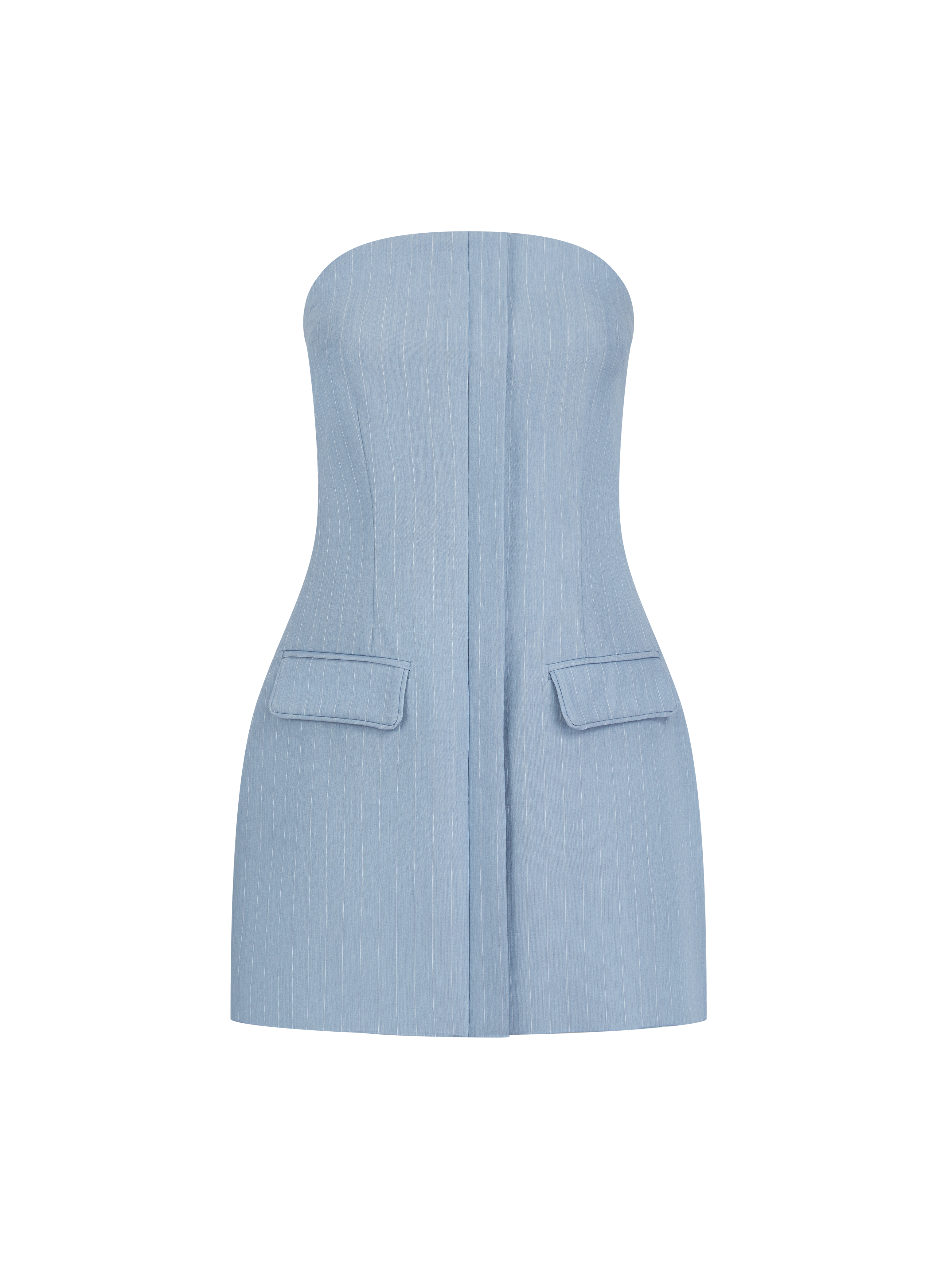 Introducing our Pinstripe Bandeau Dress in Washed Blue. Made from a soft-touch blended yarn pinstripe fabric, our fitted bandeau silhouette is fully lined for added comfort. With a silver hook and eye closure to the front and a tonal Maebe embroidered logo to the back, this versatile piece can be worn as a dress or a longline bandeau top. Elevate your style with this chic and functional piece and pair with Pinstripe Tailored Trousers and Pinstripe Oversized Shirt.