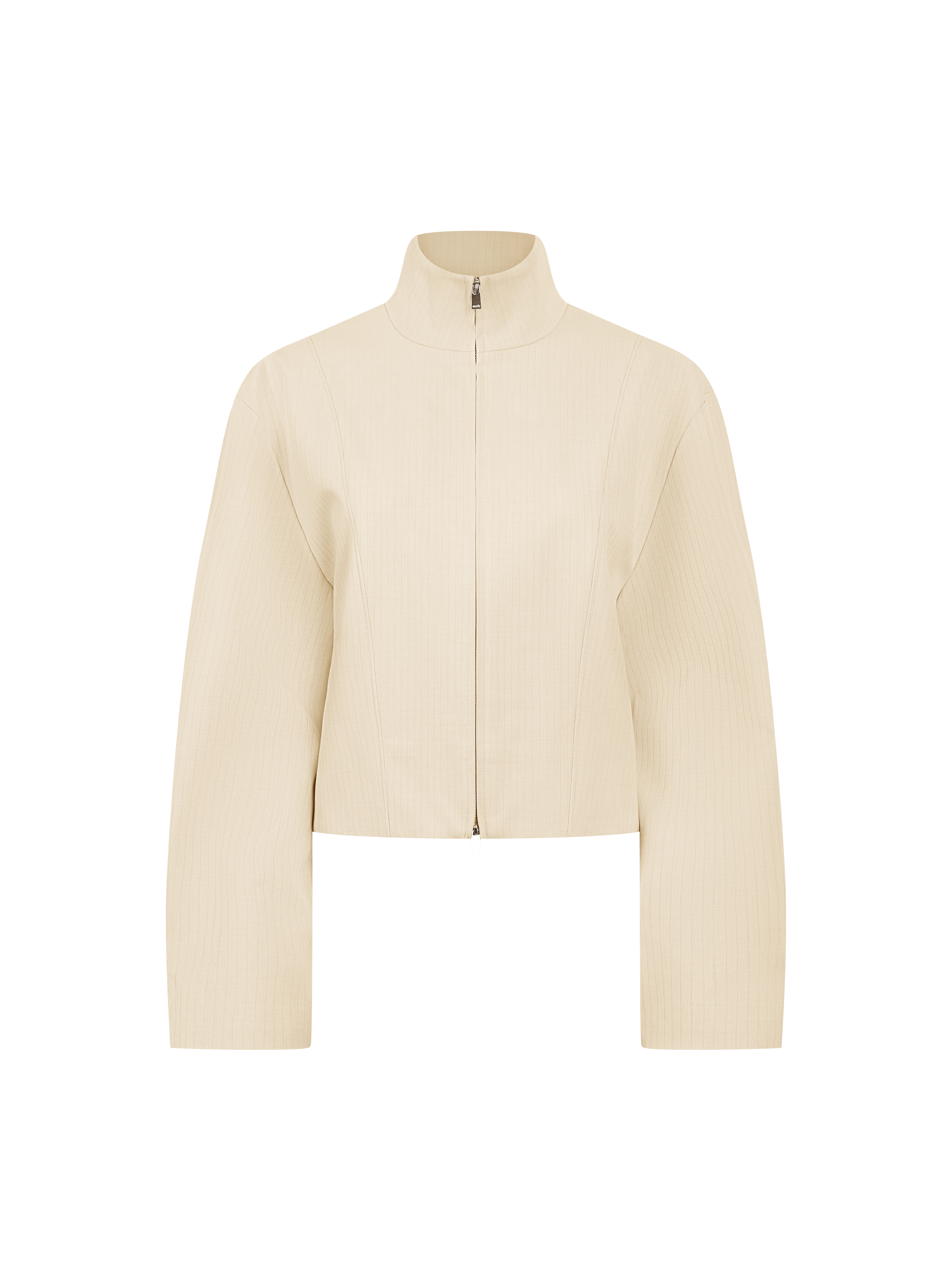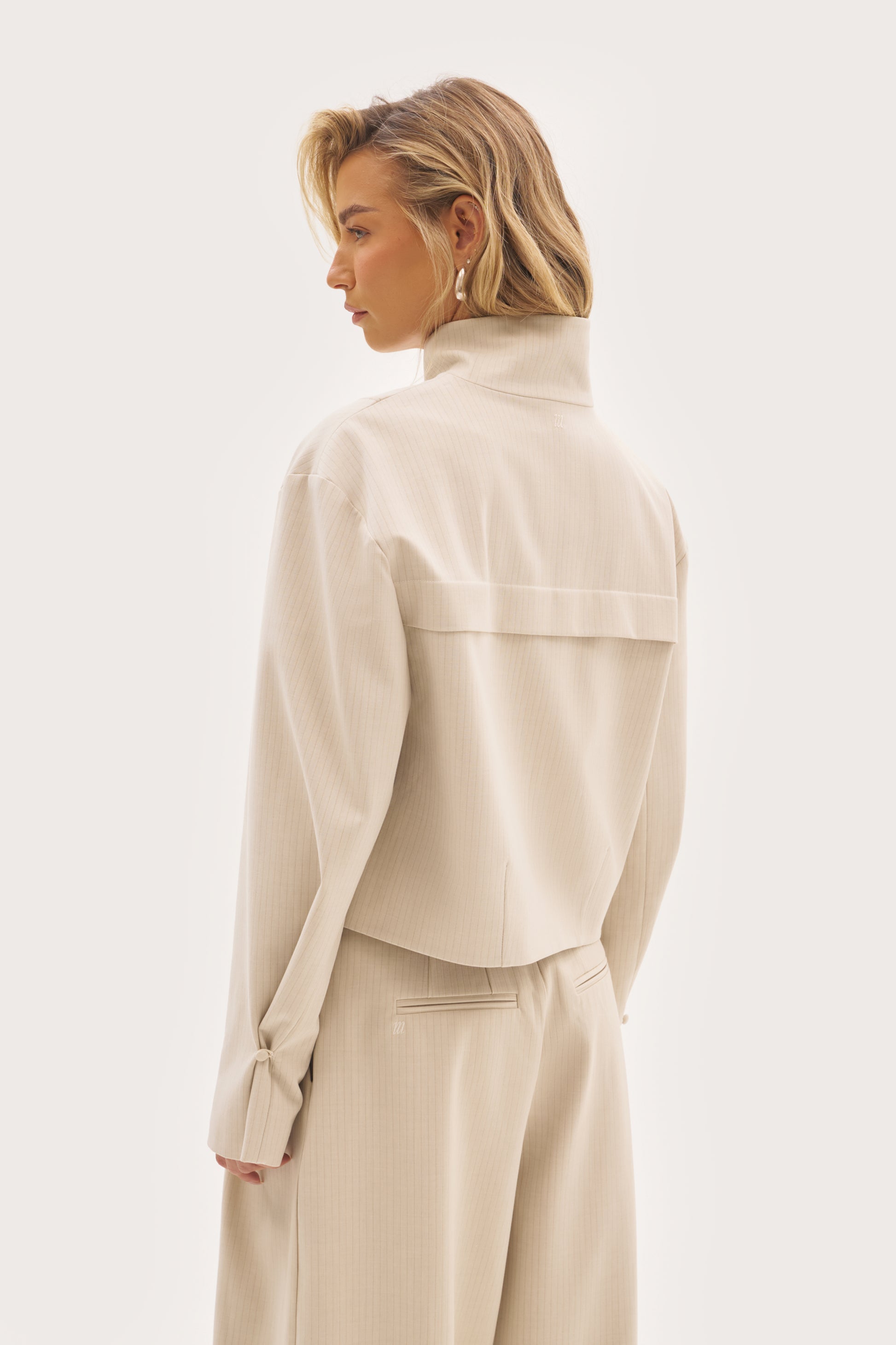 The Polina Track Jacket in Beige combines understated elegance with thoughtful design details. Crafted from subtle pinstriped fabric, this piece features a shorter funnel neck and contoured front panelling for a shaped refined silhouette. The back yoke adds interest, whilst adjustable sleeve gathering allows you to customise your look with a button fastening. Finished with a double zip, full lining, and subtle embroidered branding at the back neck, this is a versatile layer that elevates any wardrobe.