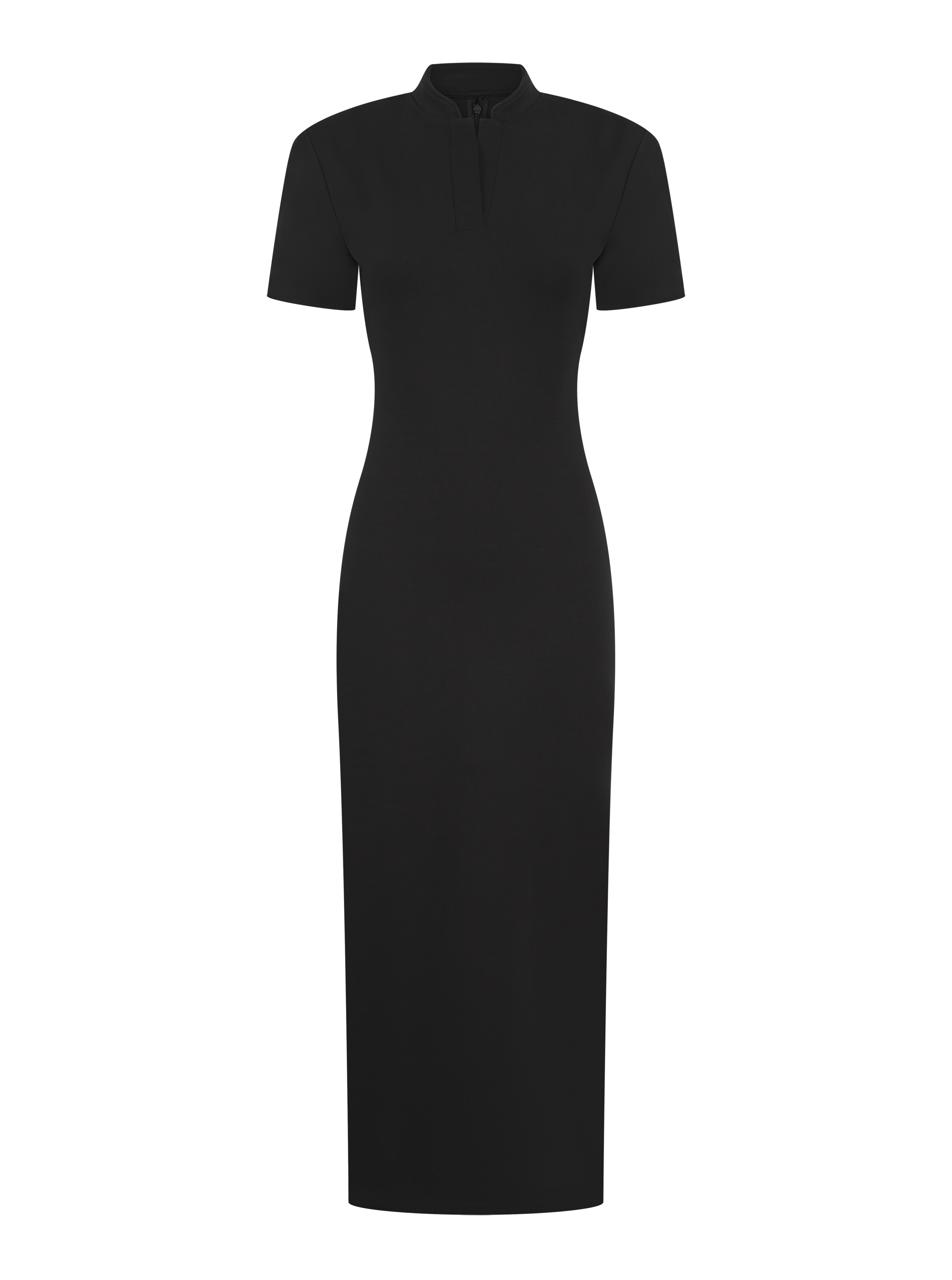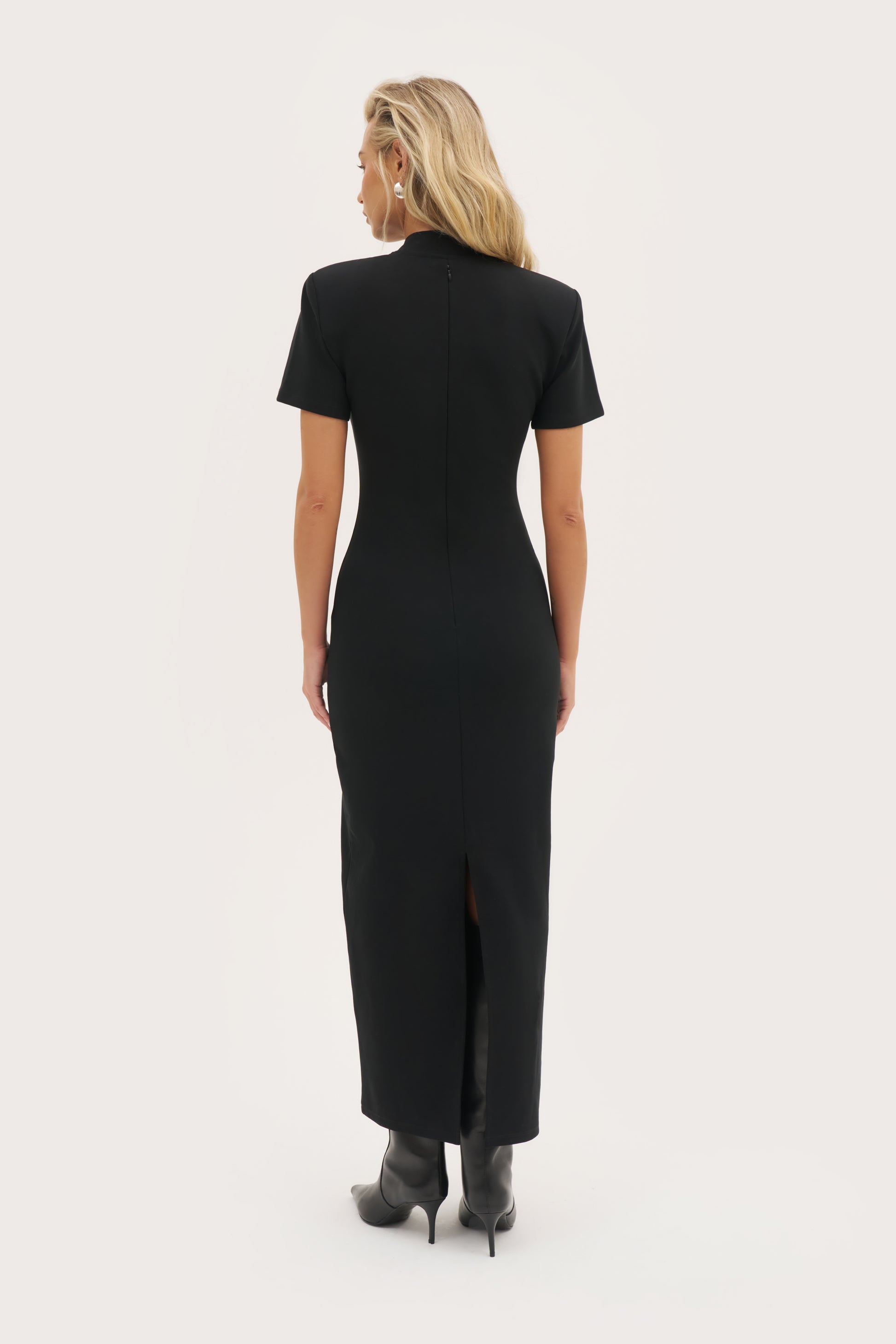 The Power Fitted Dress crafted from cotton-blend bandage fabric creates a refined, form-fitting midaxi silhouette. Designed with a mandarin collar and removable power shoulder pads, it offers a tailored, sophisticated look that can be adaptable to suit the body. A concealed centre-back zip ensures ease-of-wear, while a vent at the hem allows comfortable movement. Finished with subtle tonal Maebe embroidery at the back neck, this dress embodies elegant minimalism with modern structure, perfect for an after hours affair or power dressing at work.