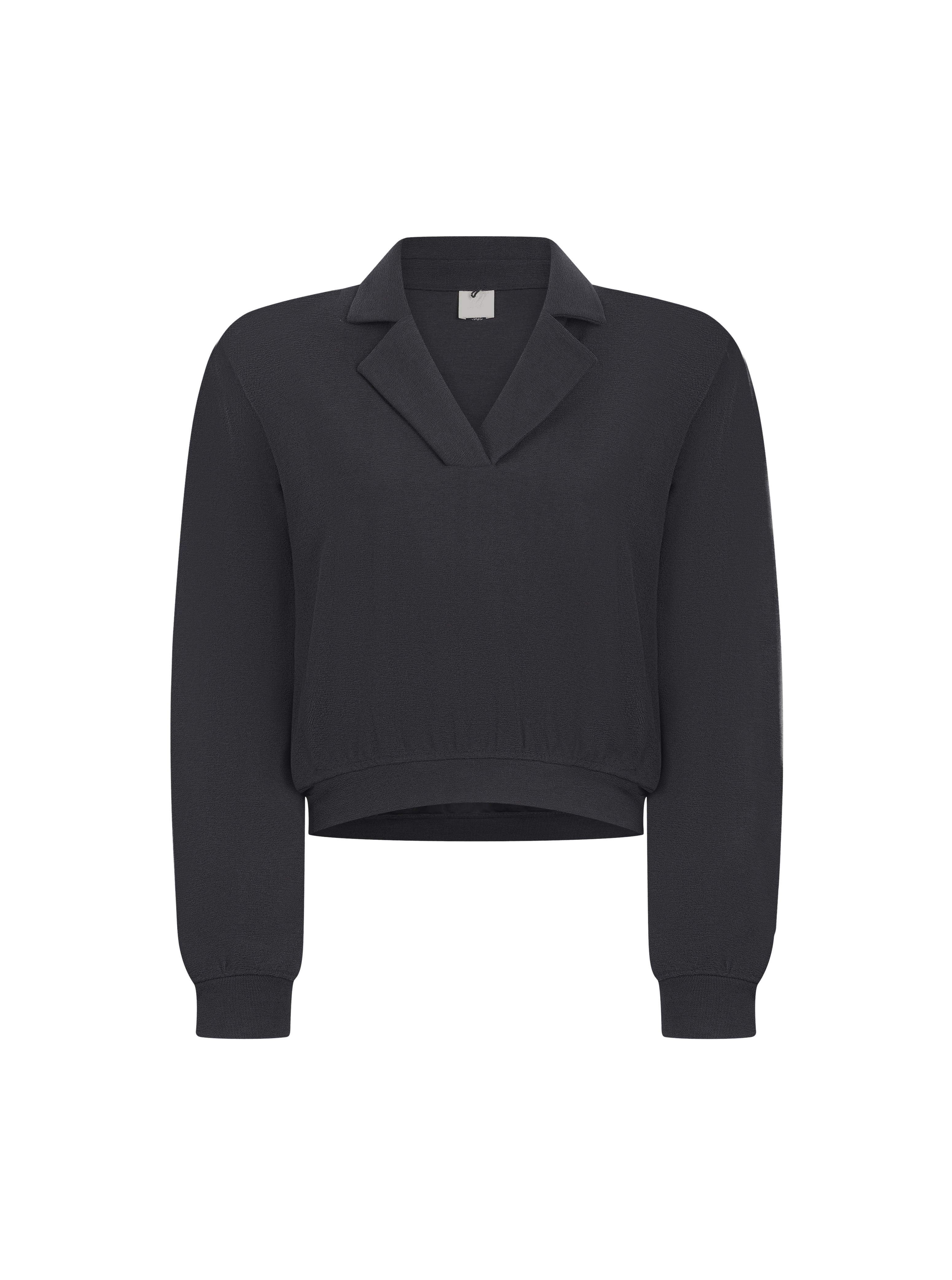 Crafted from a blended textured fabric, the Refined Jersey Collared Sweatshirt in Navy is designed to elevate your everyday wardrobe. The mid-length silhouette features a modest V-neck collar with lapel detailing, while a subtle curve to the front hem creates a flattering, contemporary look. Removable shoulder pads allow you to customise your fit, and loose-fitting sleeves with cuffed wrists add a polished finishing touch. A delicate tonal embroidered logo at the back neck completes this piece - perfect for layering or wearing alone.