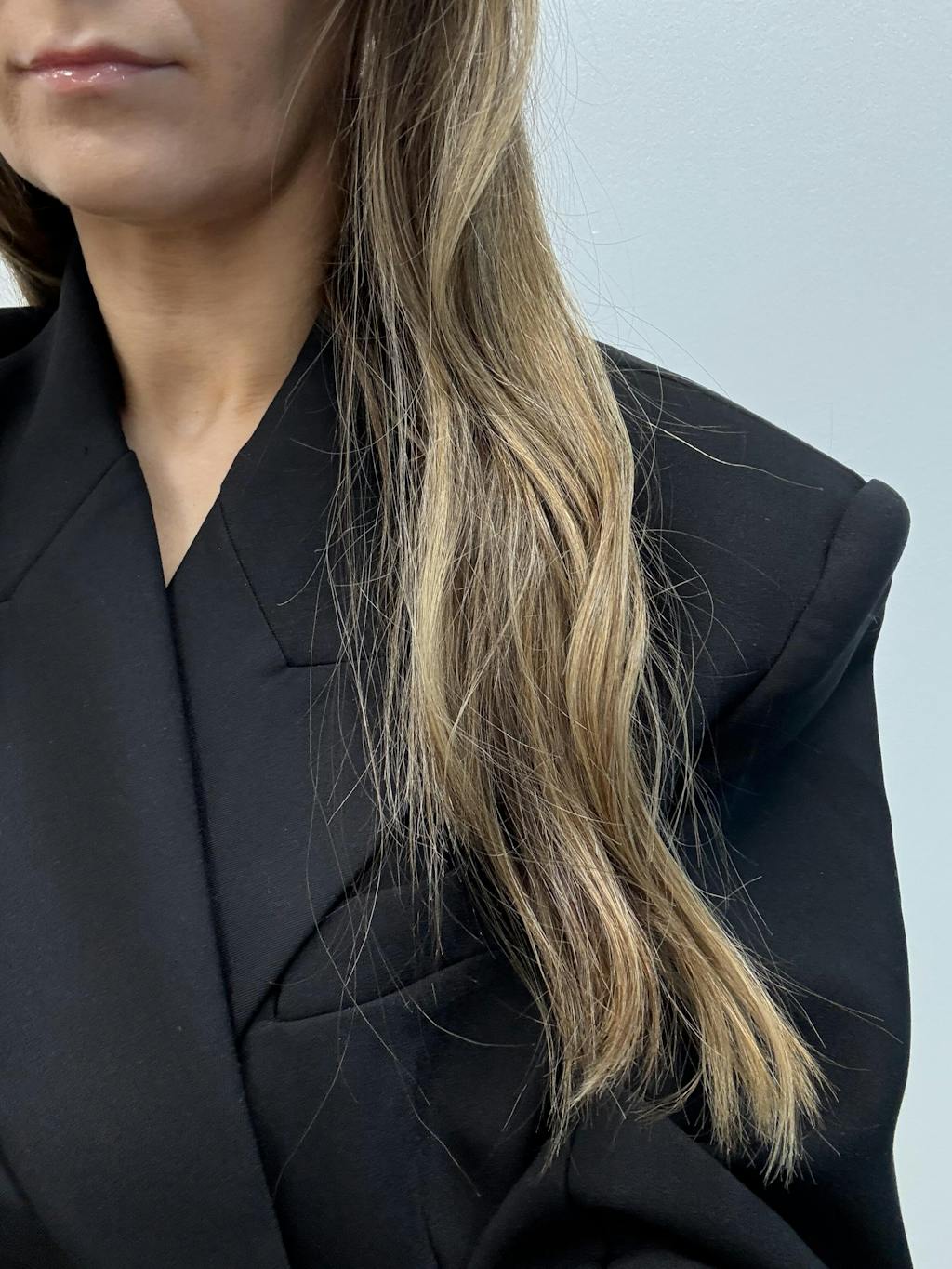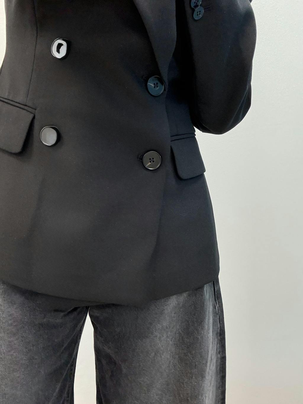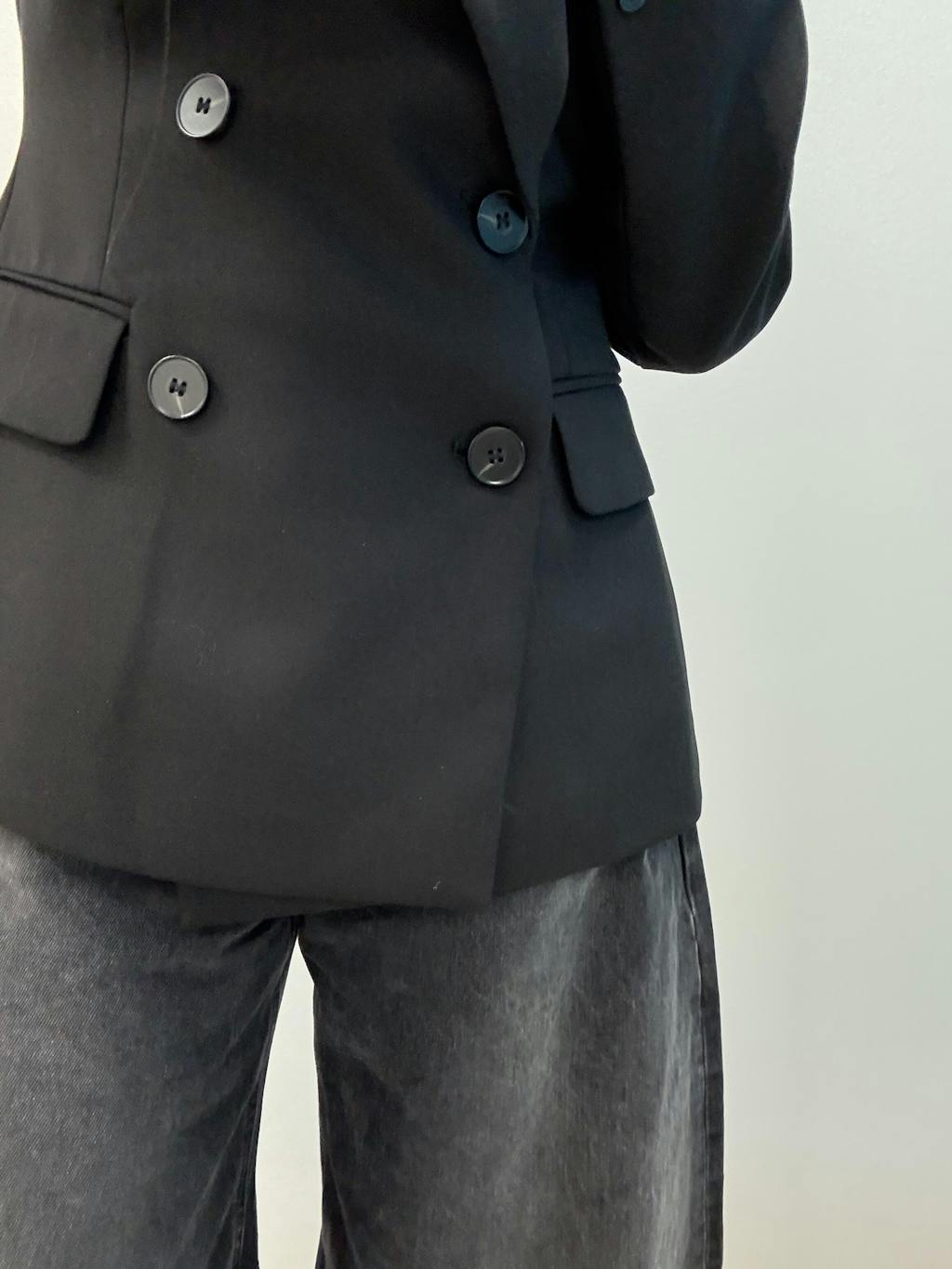 The Tailored Every Wear Blazer features a sleek blended-yarn fabric with a refined hourglass, double-breasted silhouette. The wide shoulders, complemented by internal shoulder pads create a structured, elegant shape, with a fully lined interior for comfort. Designed with jetted flap pockets and a chest welt pocket embroidered with the Maebe logo, it combines detail with sophistication. Finished with marbled matte tonal buttons with subtle yet considered Maebe branding, this blazer is an essential piece for polished, timeless style that can simply be worn in every wear, everywhere.