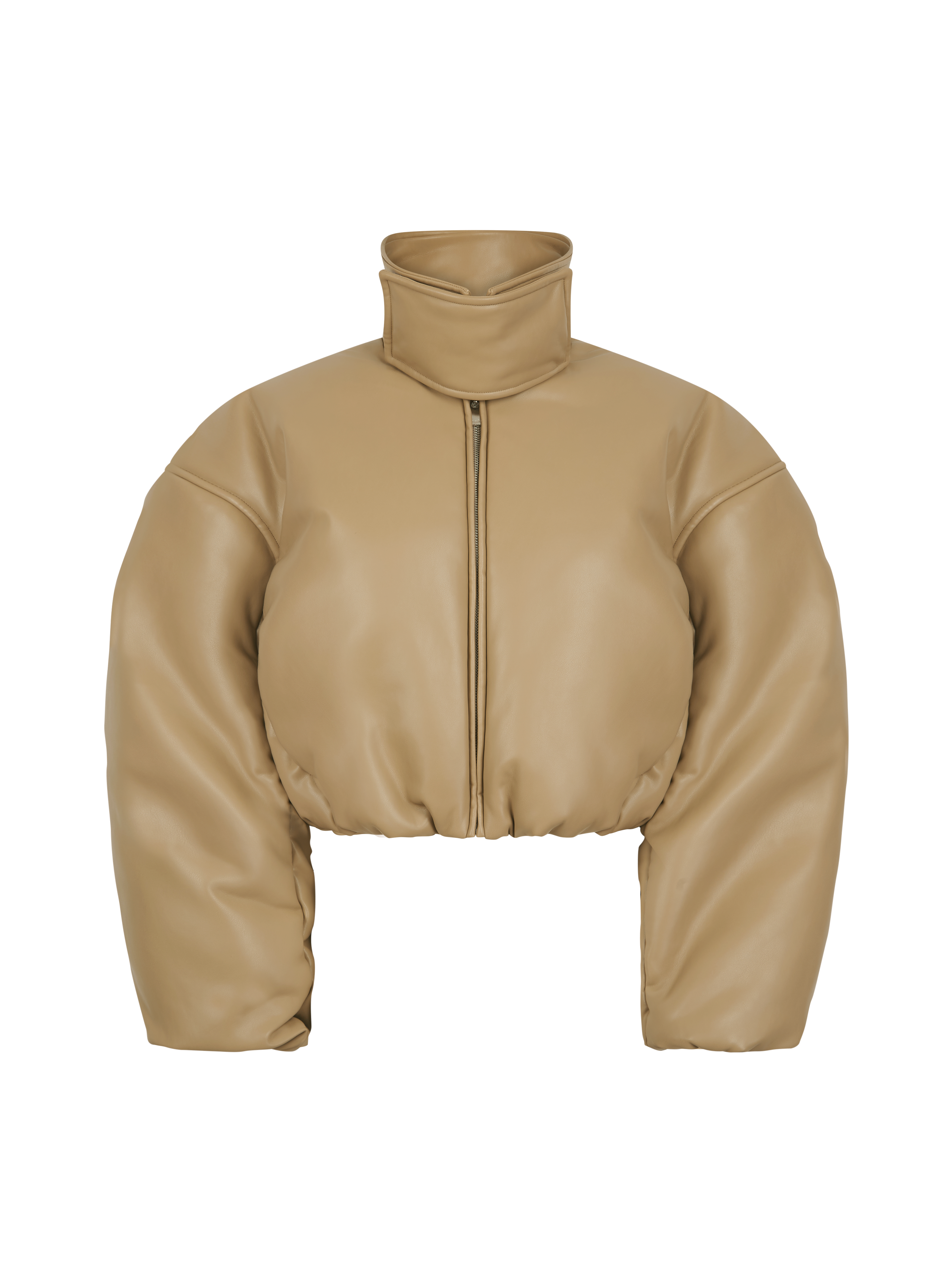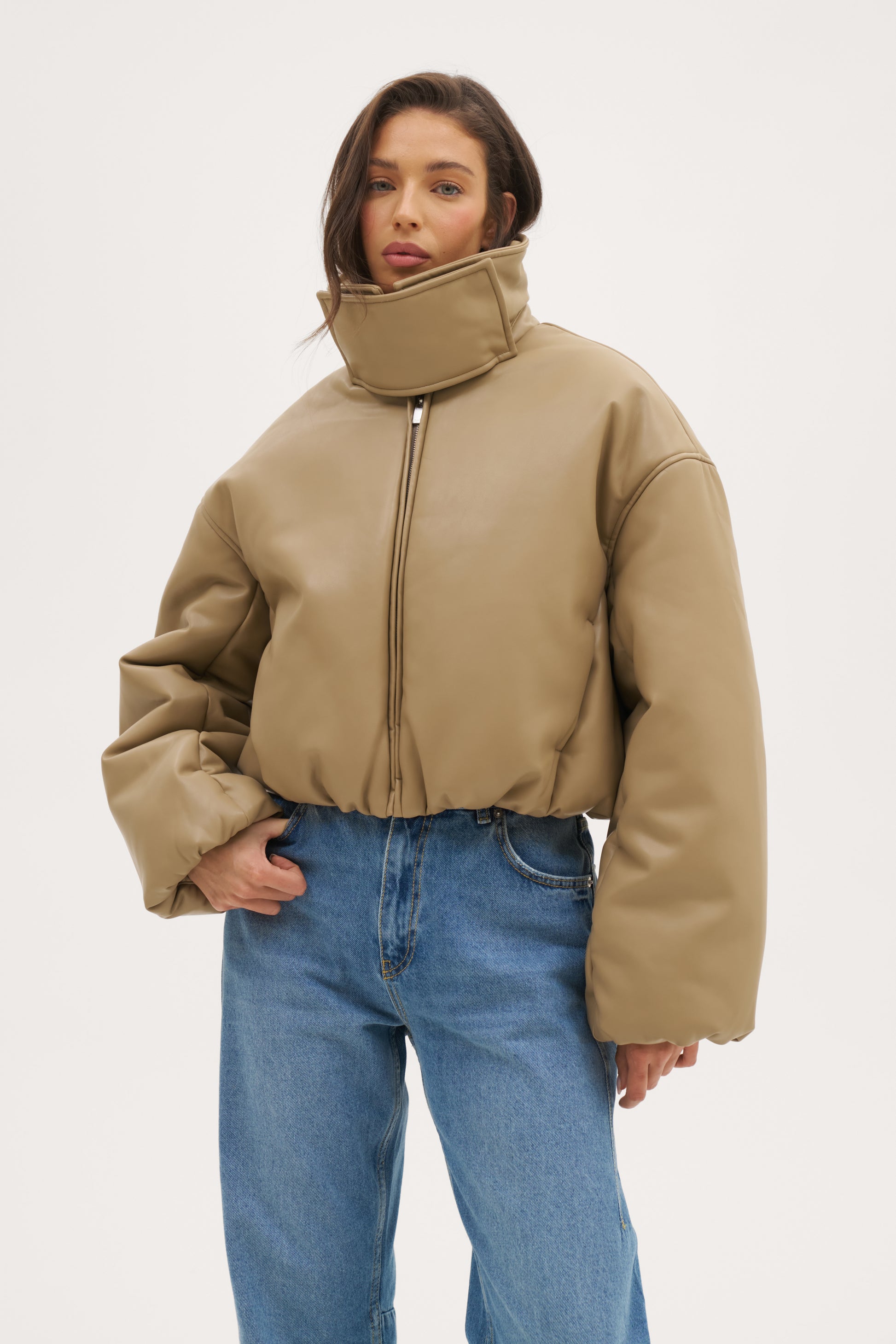 The Aspen Puffer Jacket combines effortless styling with contemporary design. Crafted from buttery-soft leather-effect fabric, this relaxed, wide-silhouette jacket features a slightly cropped cut that flatters any frame. The versatile pointed collar with removable neck strap offers two styling options, while internal elasticated hems and cuffs ensure a comfortable fit. Finished with matte silver Maebe branded hardware, and a distinctive 3D debossed patch every detail has been considered. A sophisticated staple within the  outerwear collection.