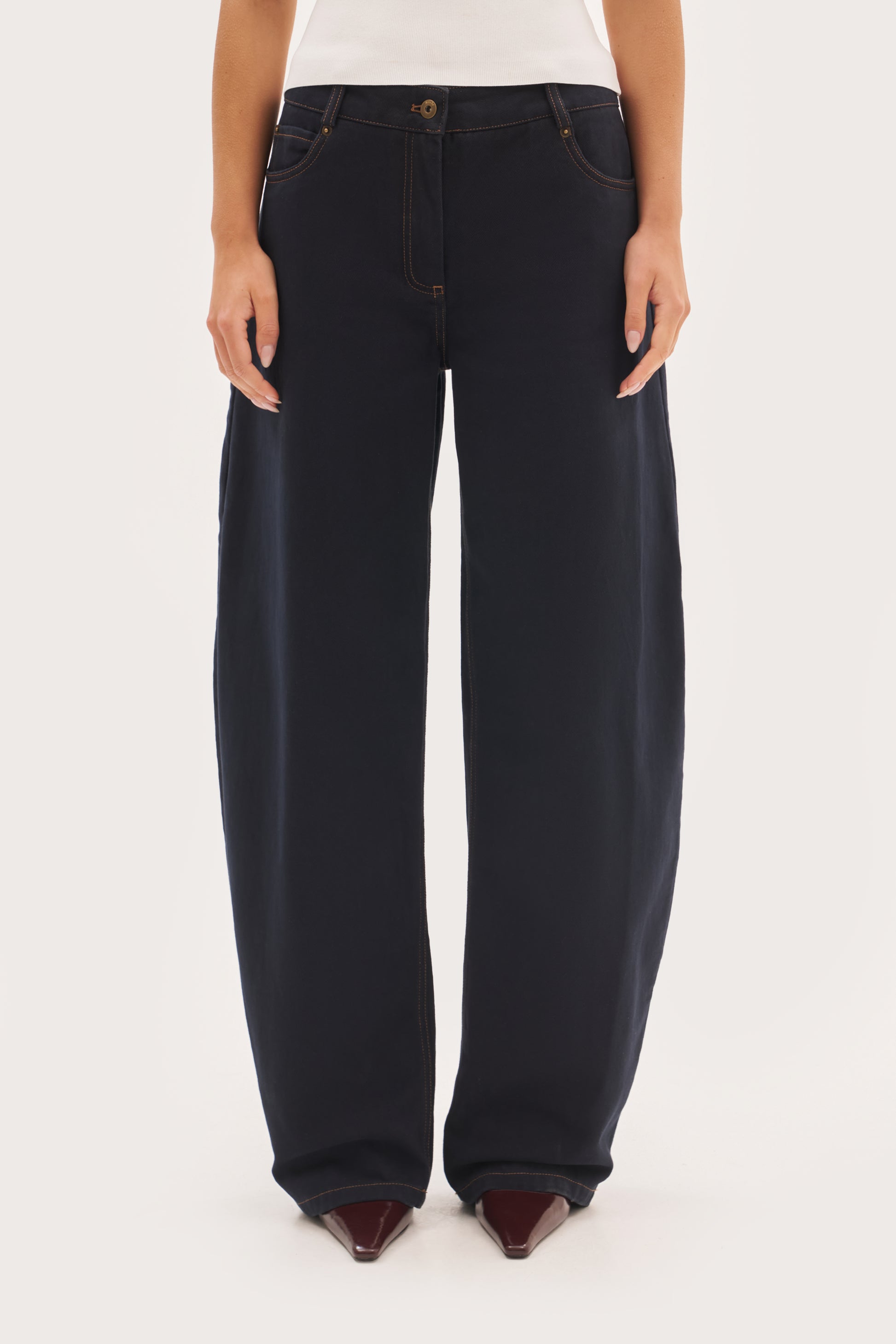 Crafted from premium navy cotton twill, the Banana Fit Jeans offer effortless versatility for any occasion. Designed with a relaxed banana silhouette and extended length, they balance comfort with modern shape. A concealed adjustable waistband allows for discreet customisation, ensuring all-day comfort. Finished with antique brass hardware and a branded button fastening, the design is elevated by contrast stitching and a branded back patch for subtle character. Thoughtful details such as the shaped yoke and angled back pockets enhance both comfort and style.