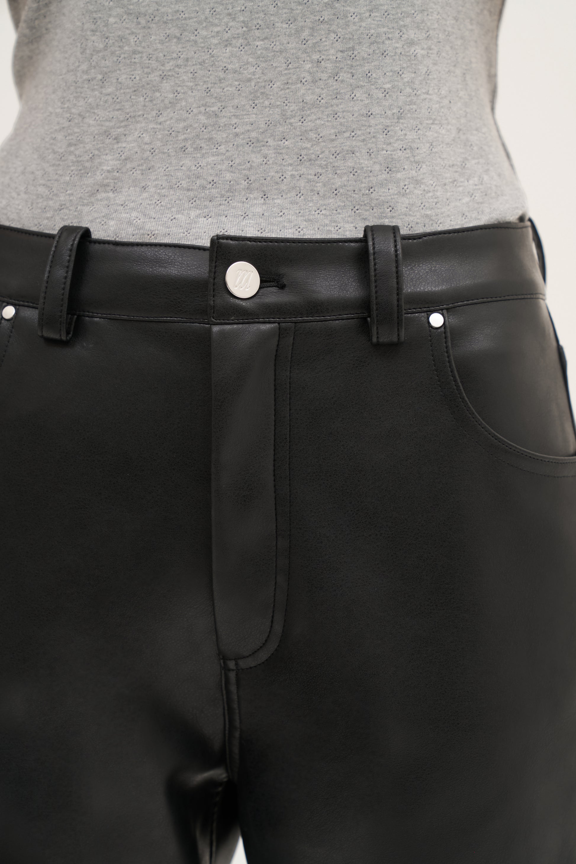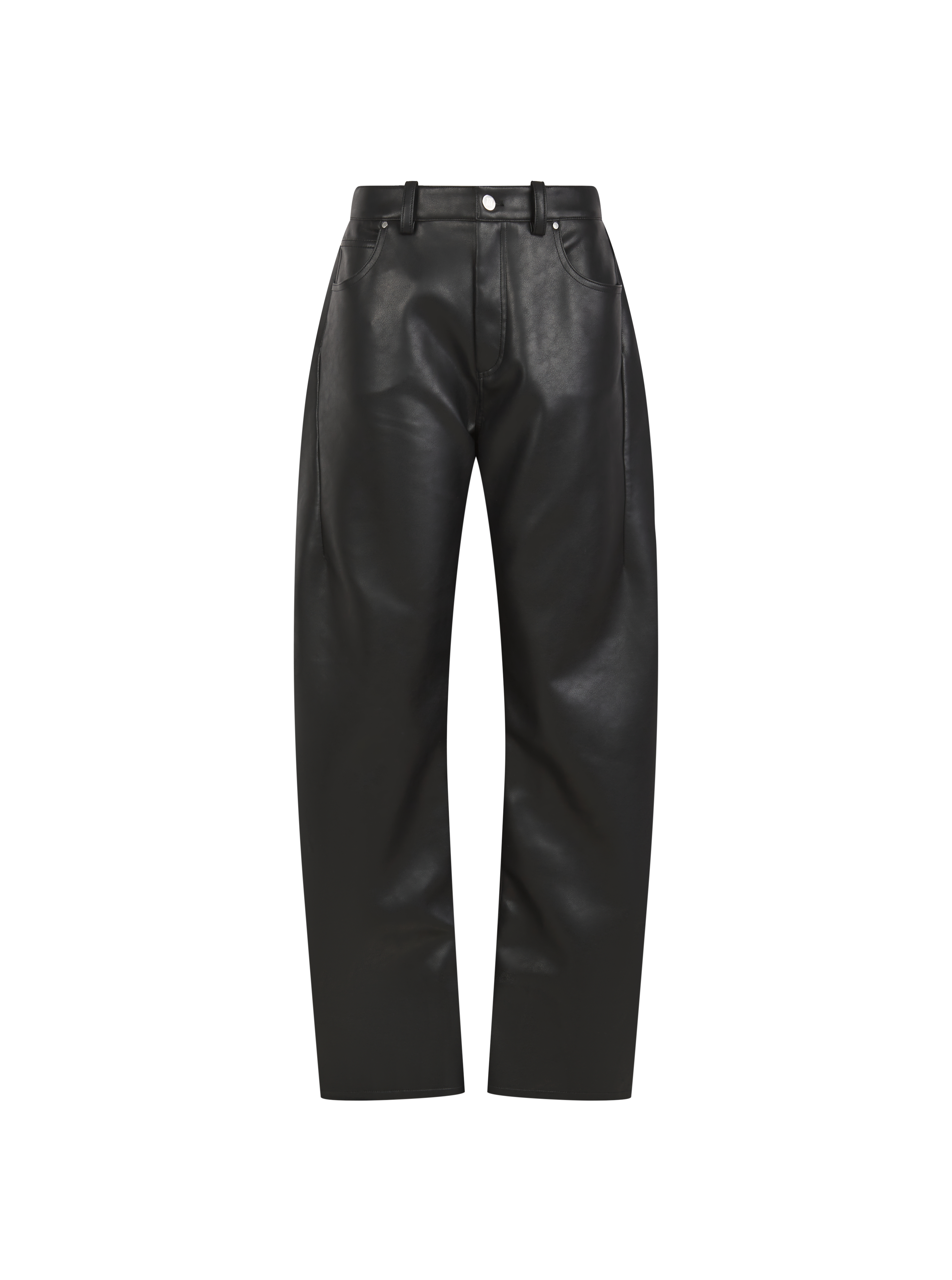 Elevate your wardrobe with these Barrel Leather-Effect Trousers in chic classic black. Crafted from smooth leather-effect fabric with a structured silhouette, they feature a subtle barrel-leg cut enhanced by strategic side seam darts for a refined fit. The discreet adjustable waistband, and back yoke detail ensures fit is perfected. Finished with a Maebe leather-effect patch branding, and signature matte silver shank button and rivets, these trousers deliver understated edge to any outfit.