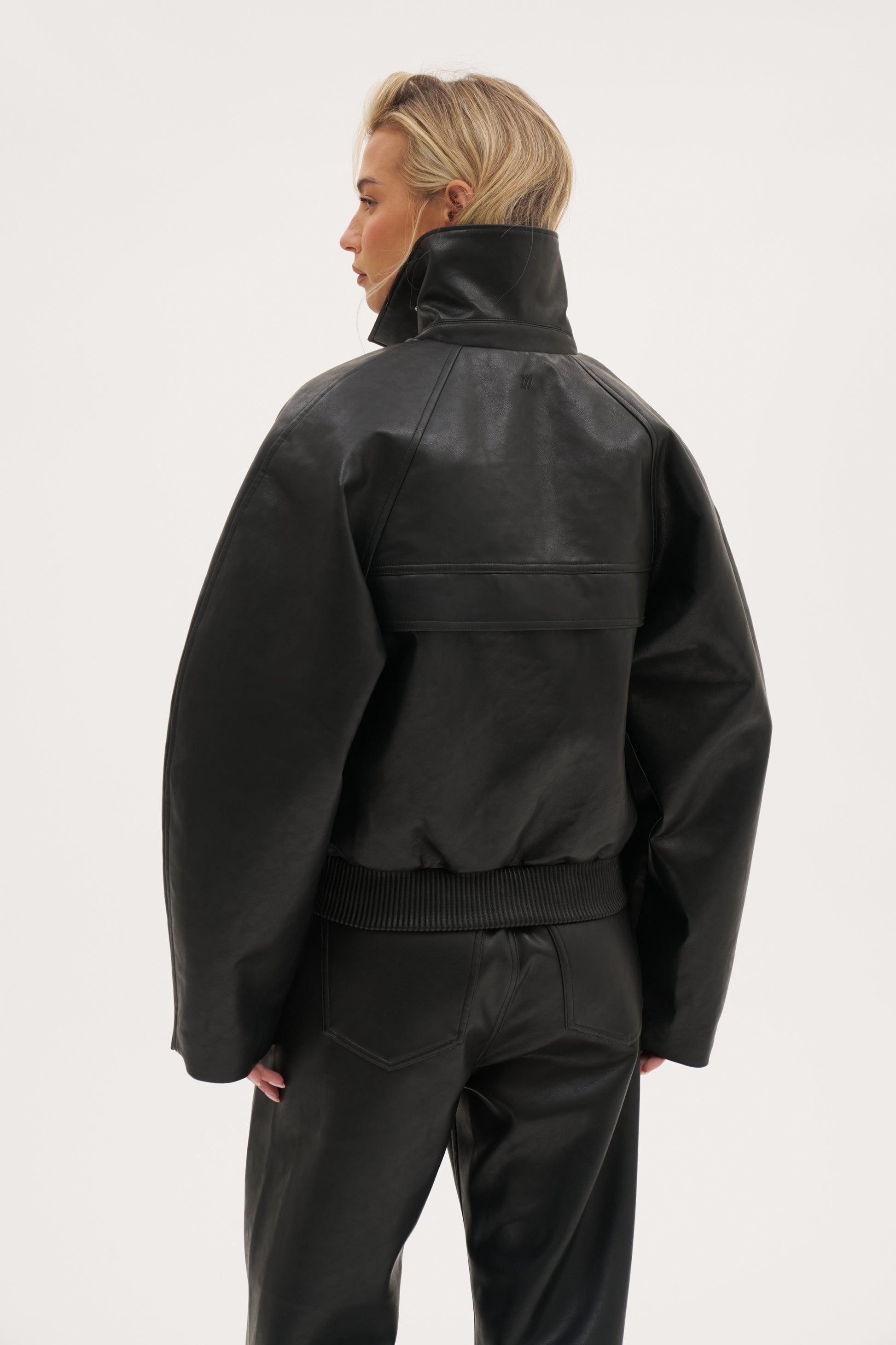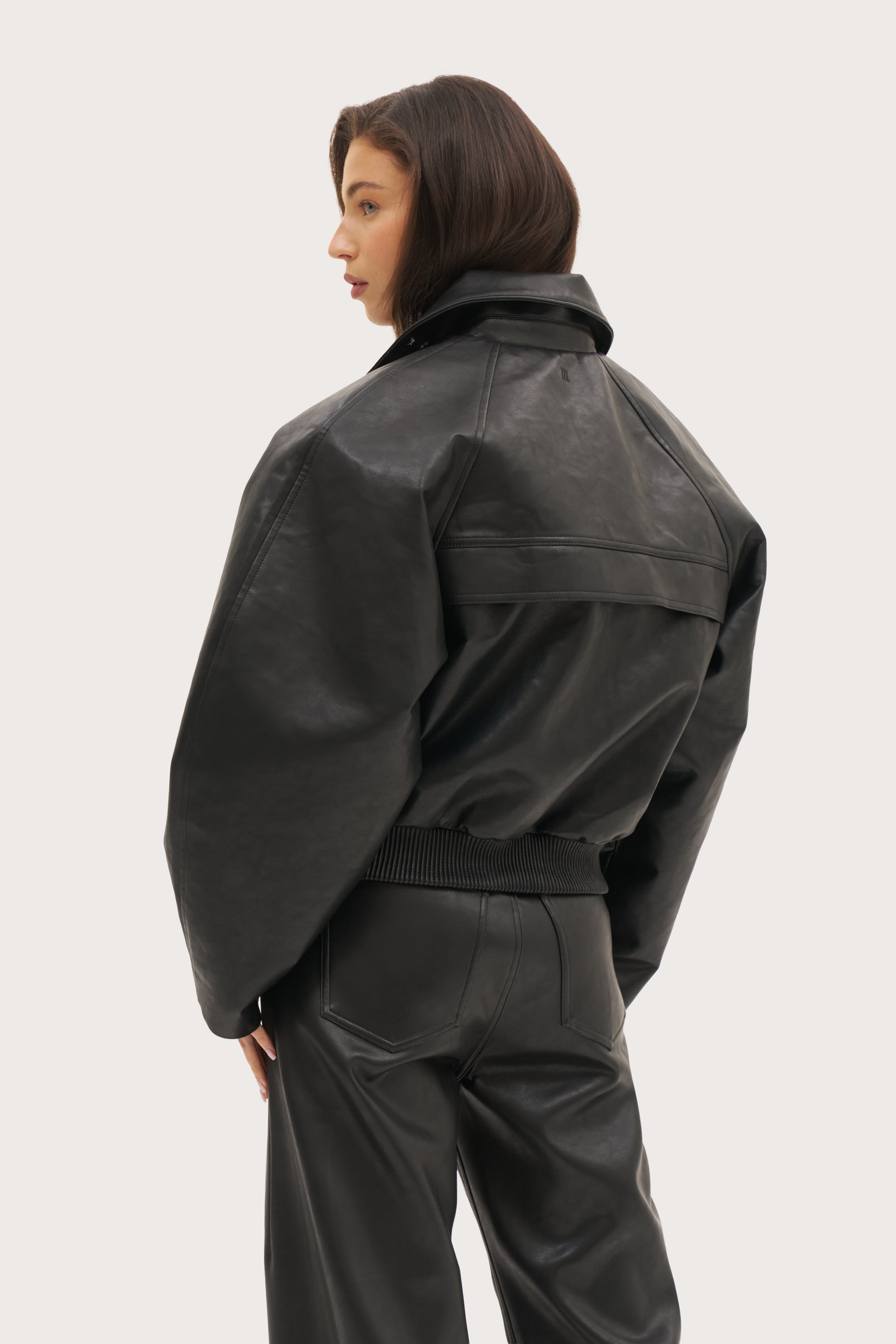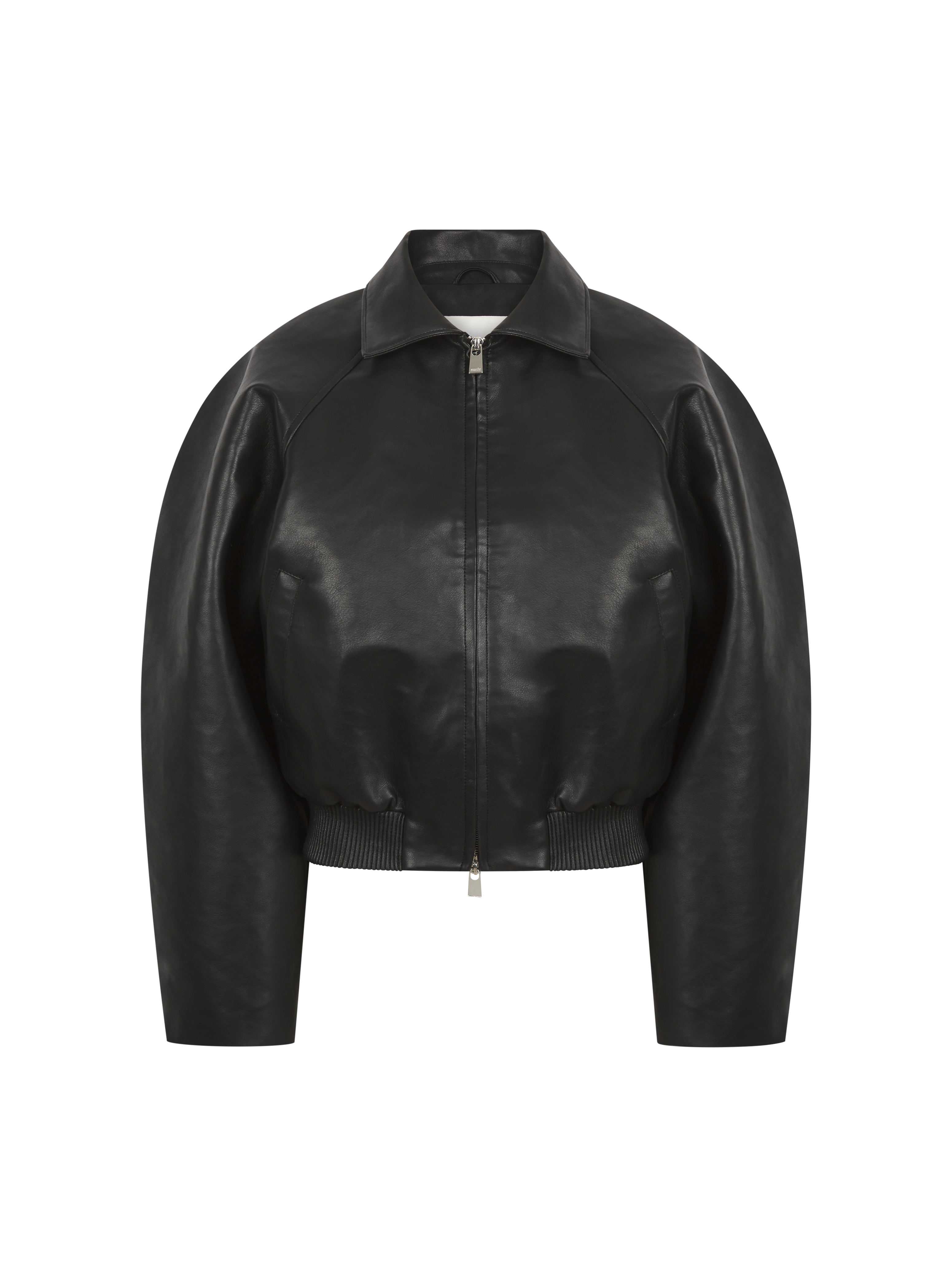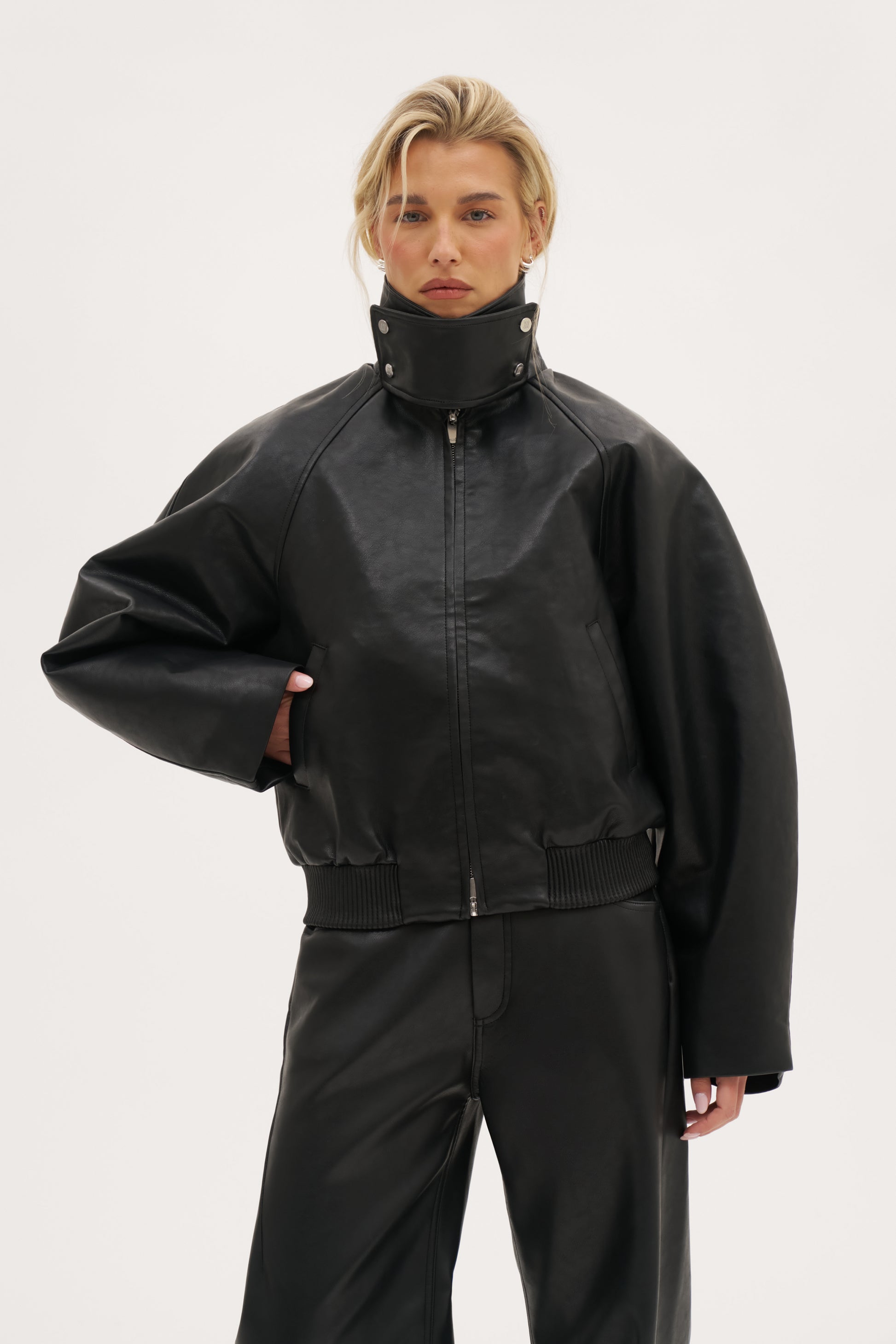 Elevate your outerwear with this sleek, leather-effect jacket featuring sculptural cocoon sleeves that redefine silhouette and form; while the funnel neck with removable strap offers versatile styling, wear it high for drama or fold it down for understated chic styling. Practical double-ended zip closure and welt pockets ensure functionality without compromise. Finished with matte silver Maebe branded hardware and a fully lined interior, this piece seamlessly transitions from day to evening wear.