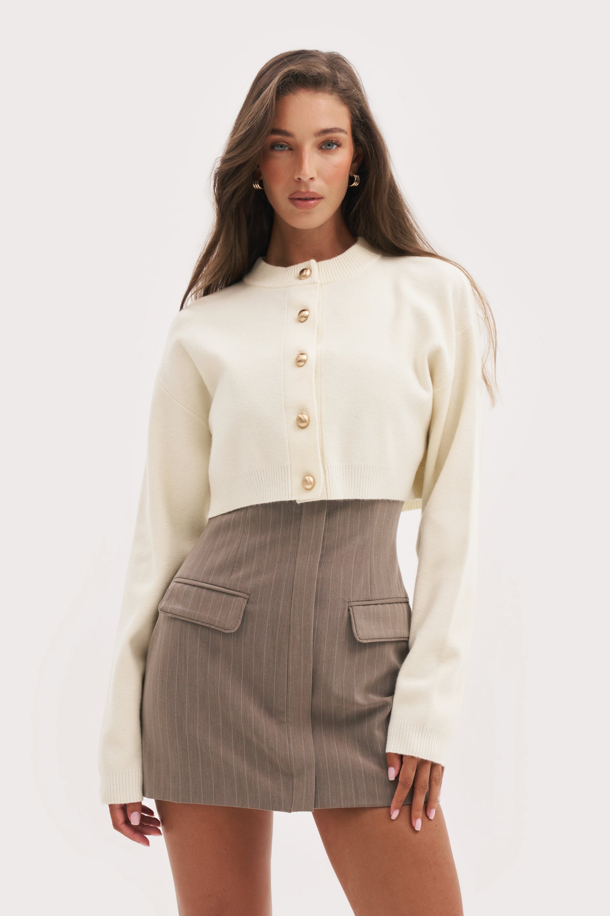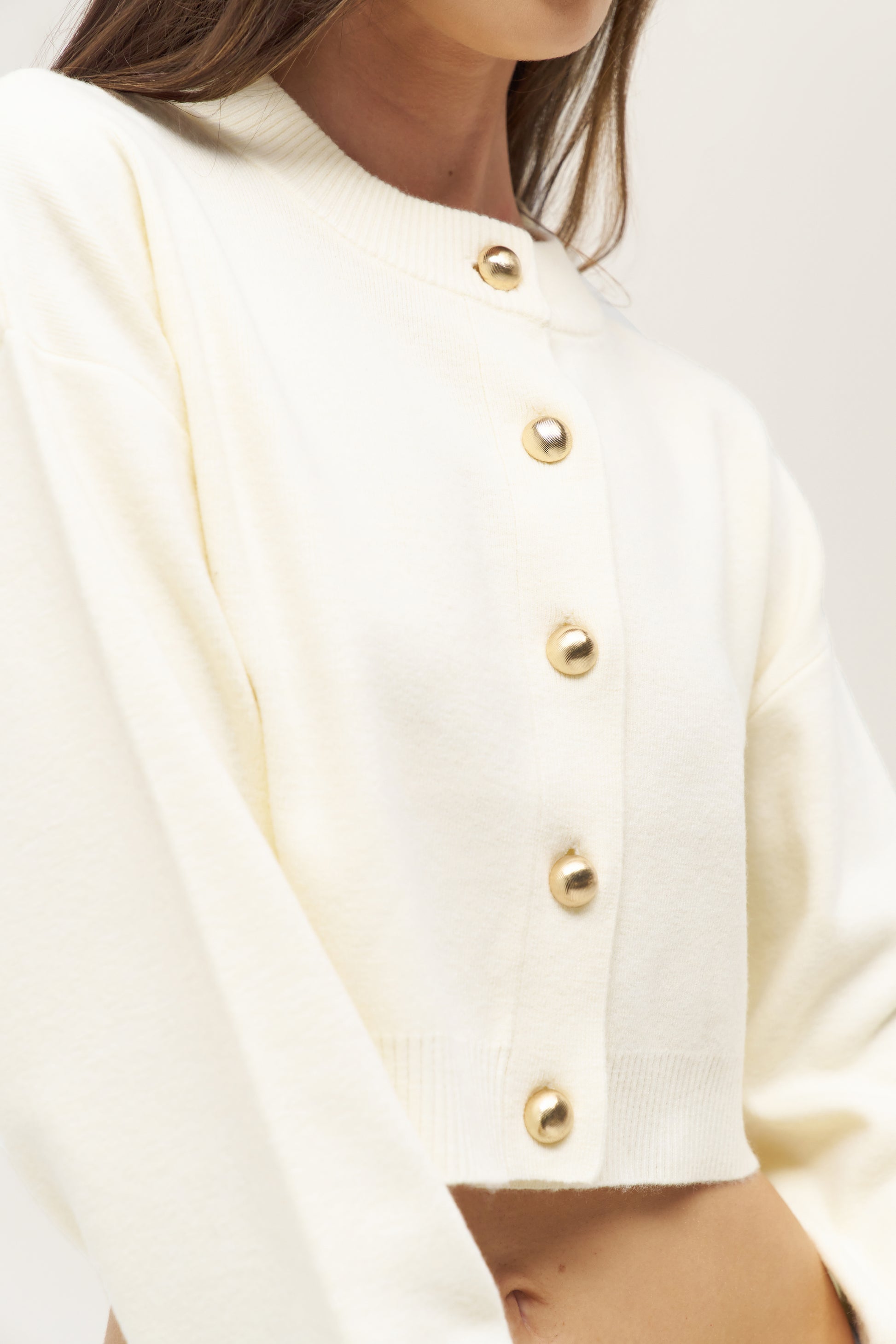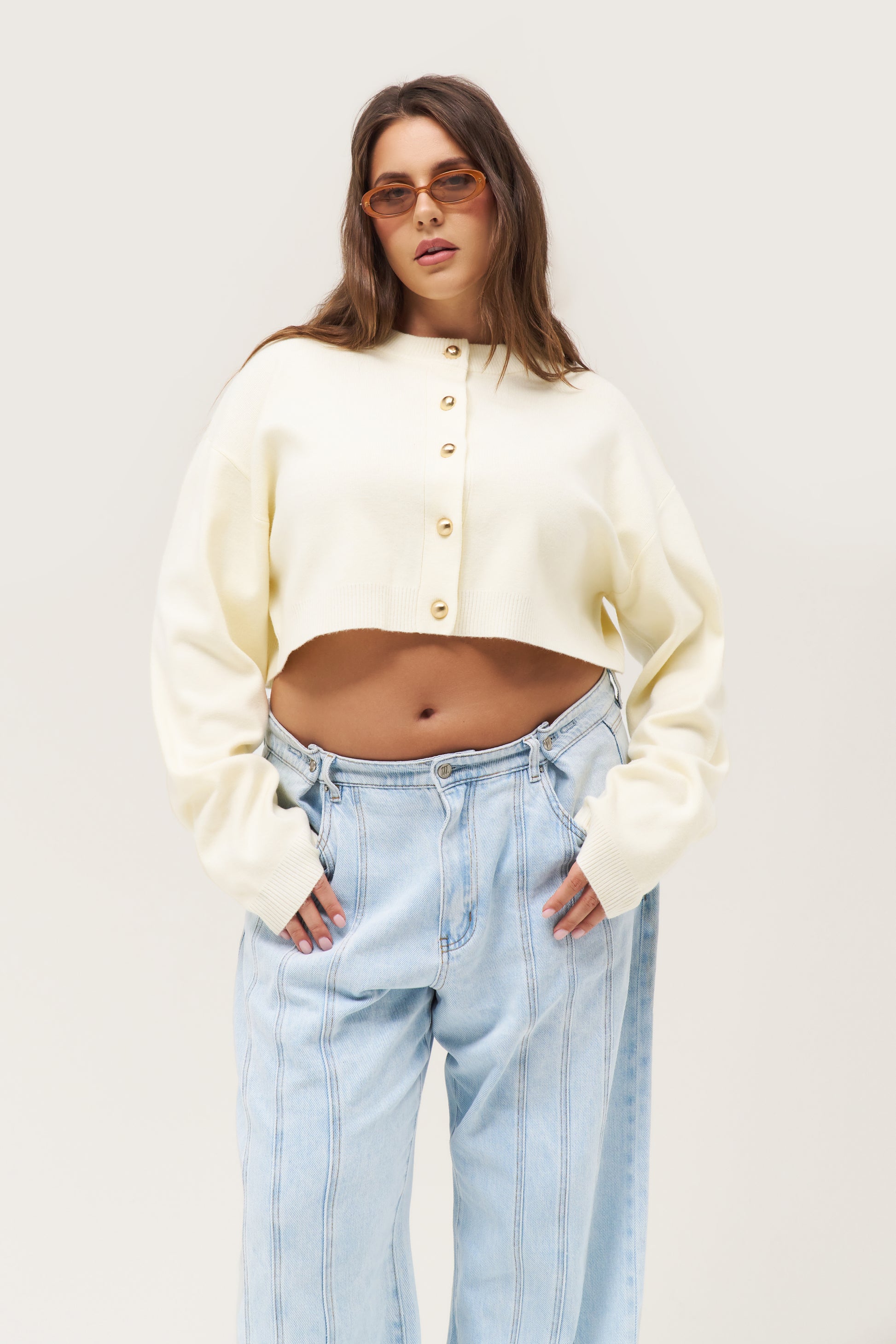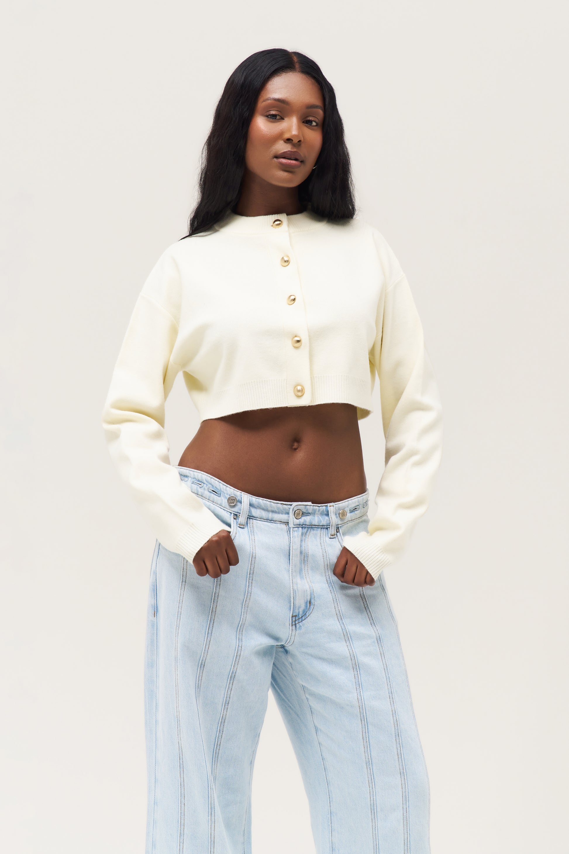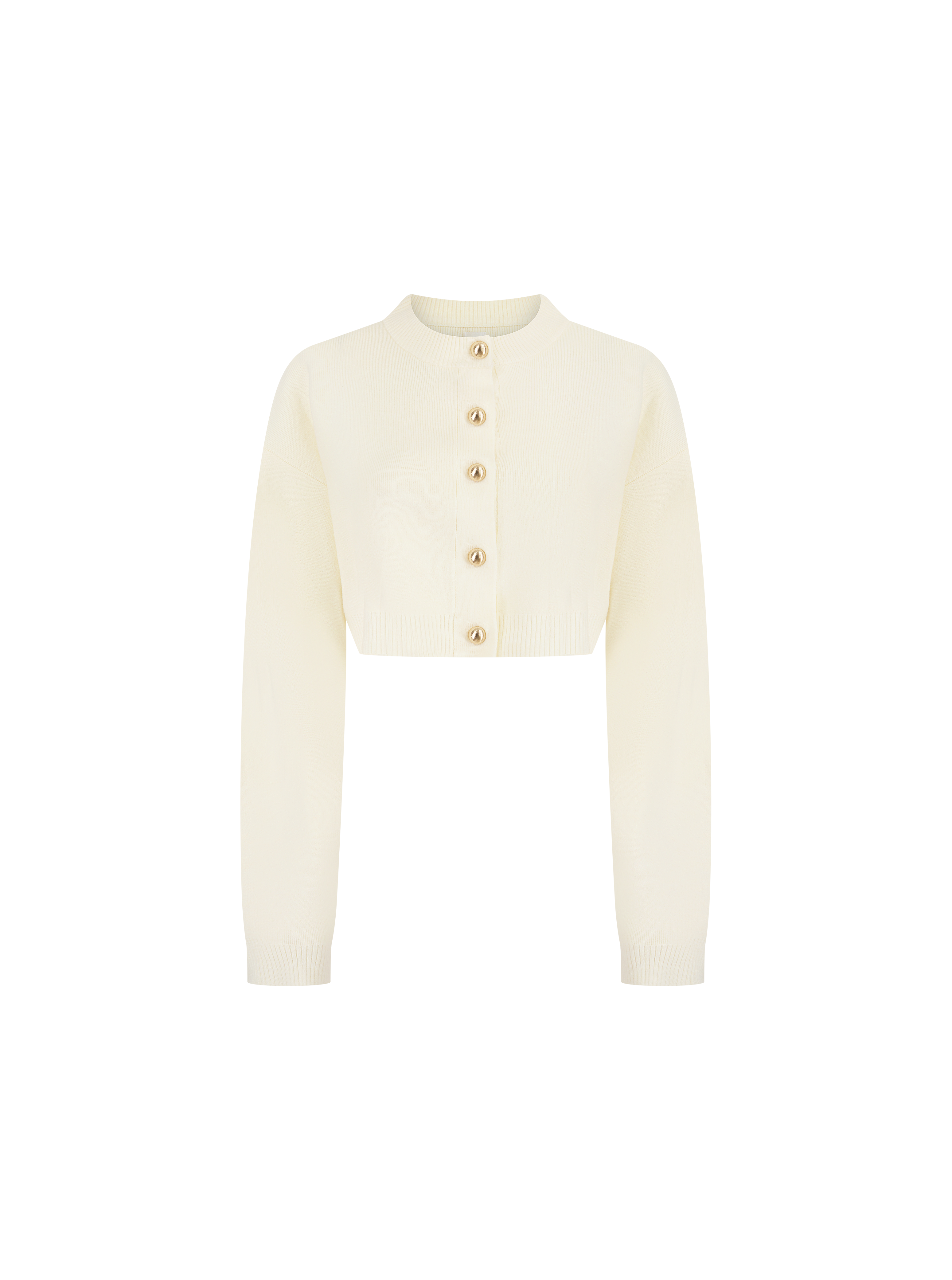 The Cosy Cropped Cardigan is made from a dense compact knit with a touch of wool for a cosy (not scratchy), elevated feel. The perfect juxtaposing piece; a classic cardigan detailing with metallic domed buttons and soft wool mix fabric, with a relaxed cropped fit and exaggerated length sleeves.