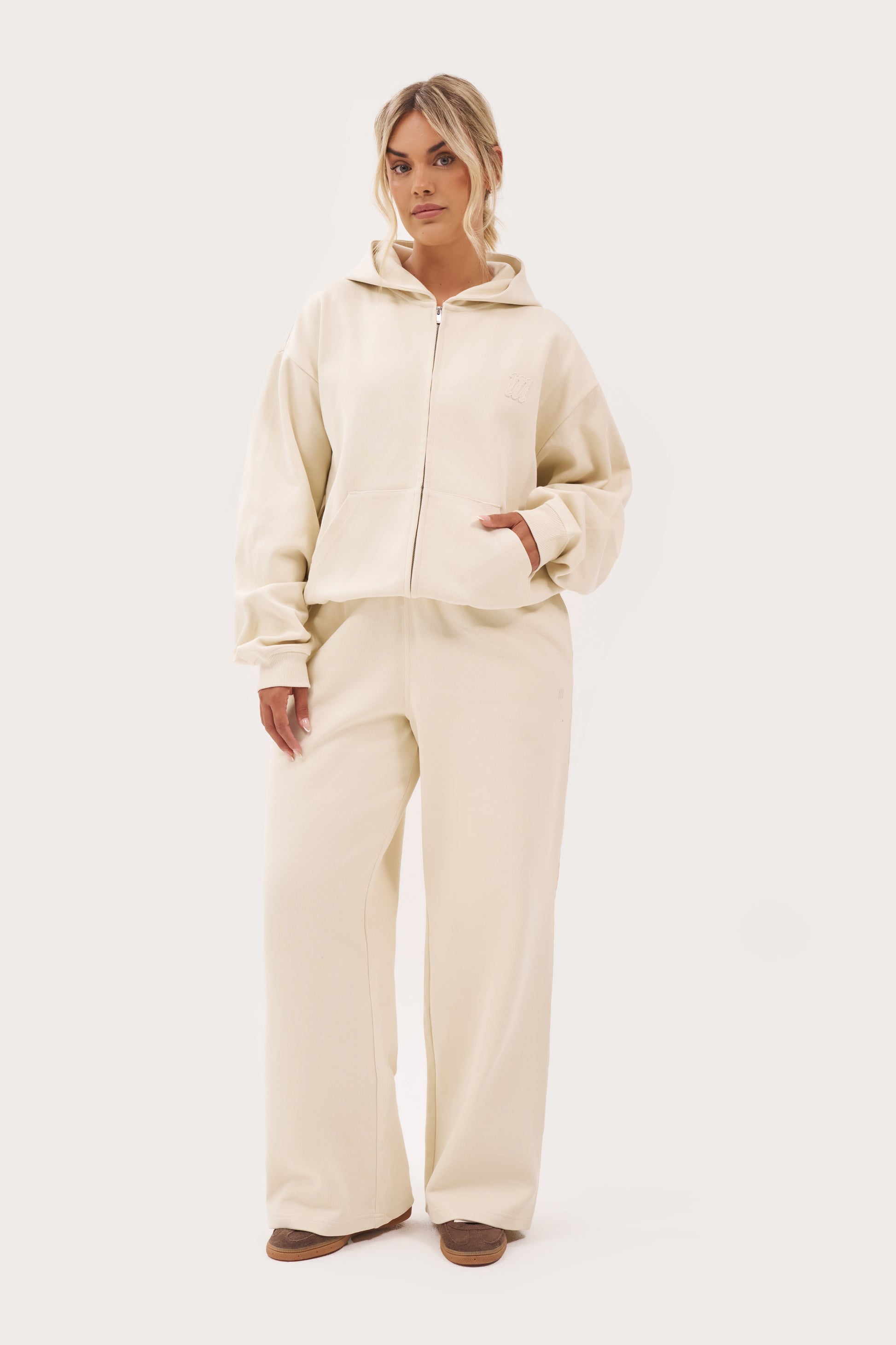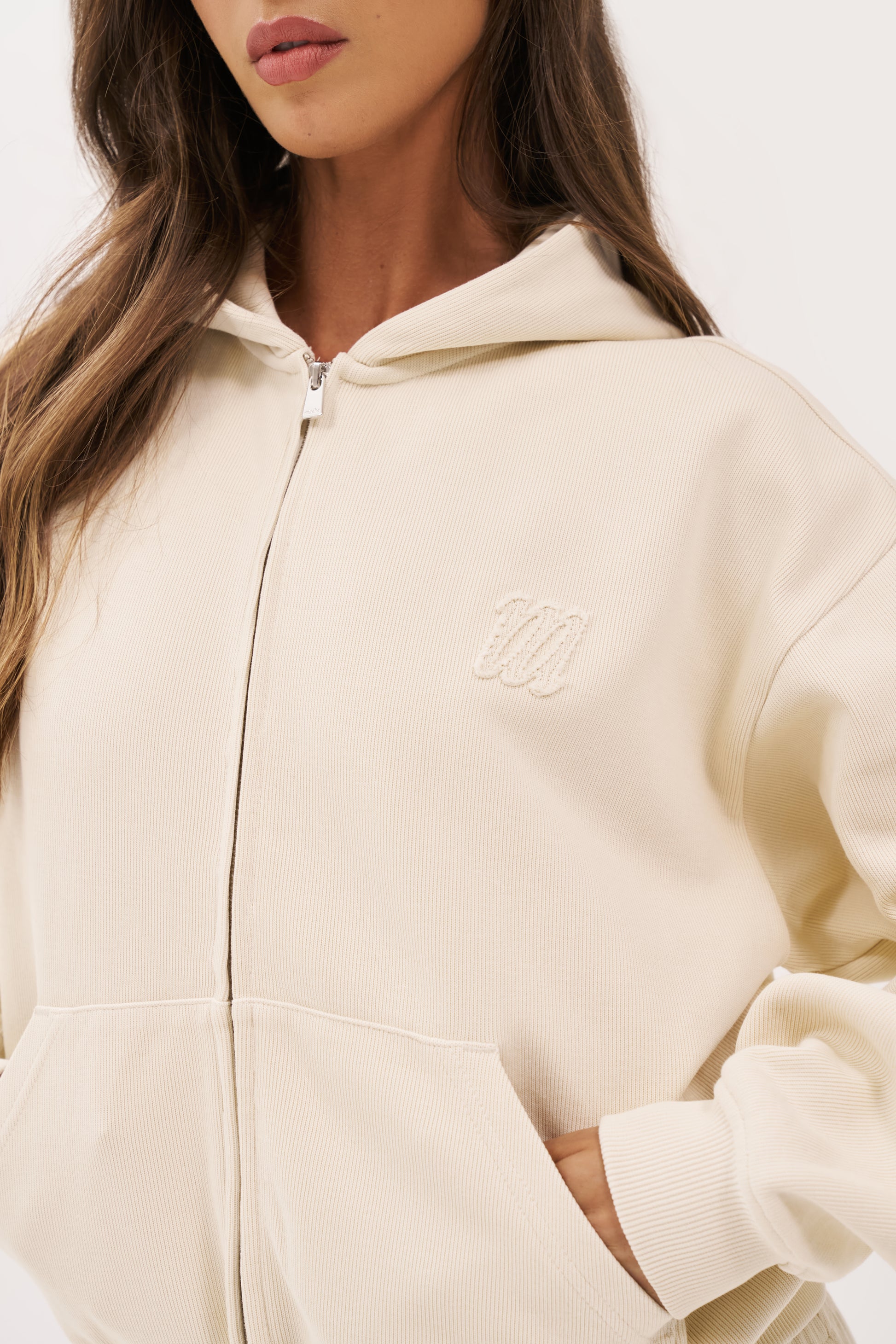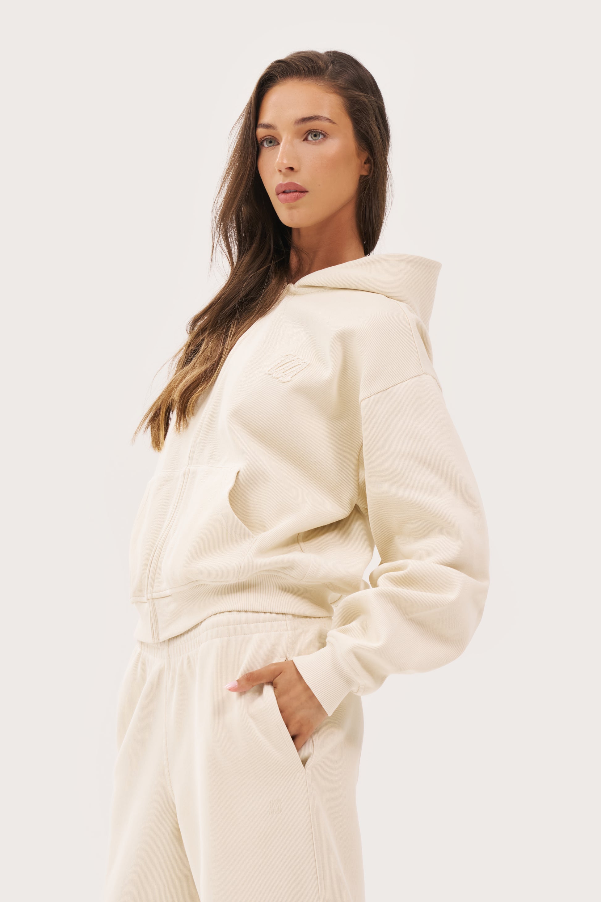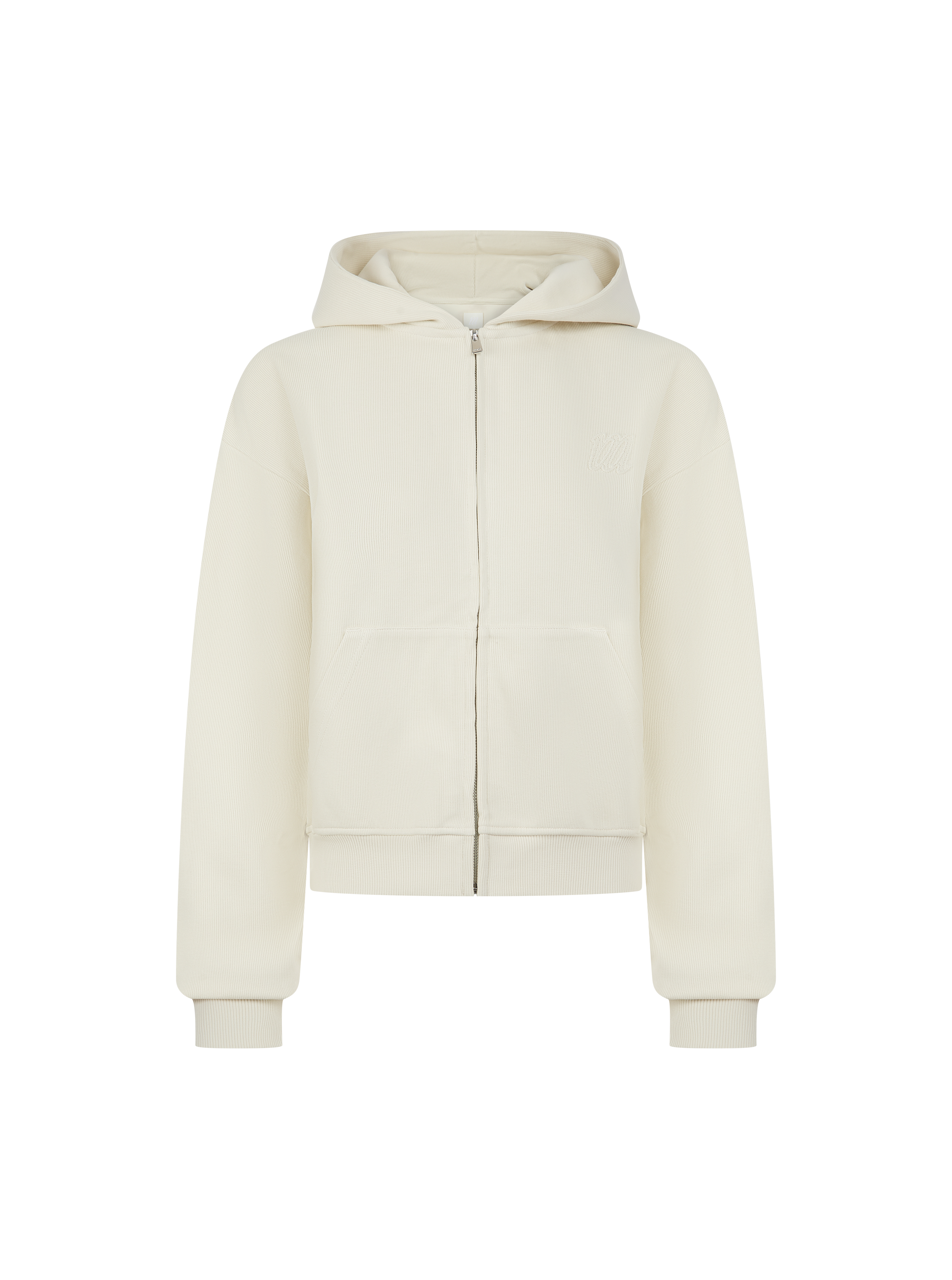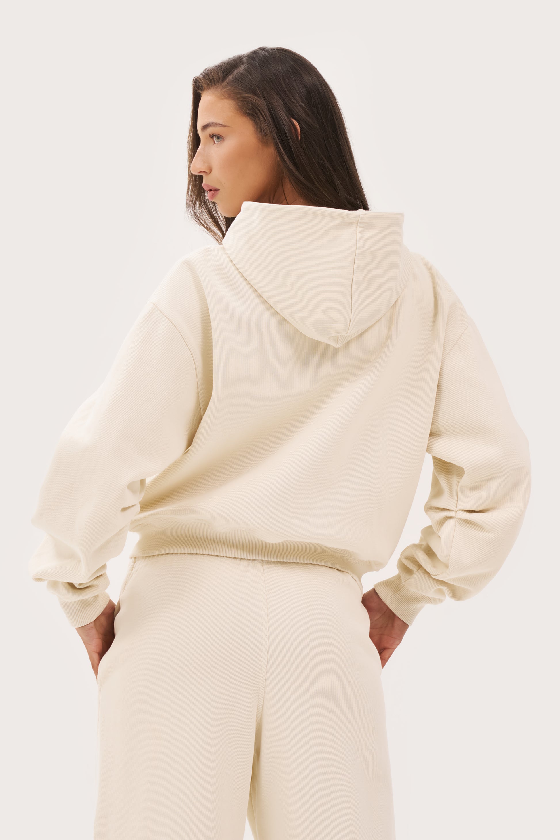 The Daily Errands Mid Length Hoodie in Vintage White is an everyday, everywhere staple. The relaxed, mid-length silhouette made from soft cotton interlock jersey offers comfort, while the internal popper allows for length adjustment and versatility; wear cropped or mid-length depending on the occasion. The unique balloon sleeve silhouette with pleats is complemented by our signature distressed Maebe logo branding and silver engraved zip puller.