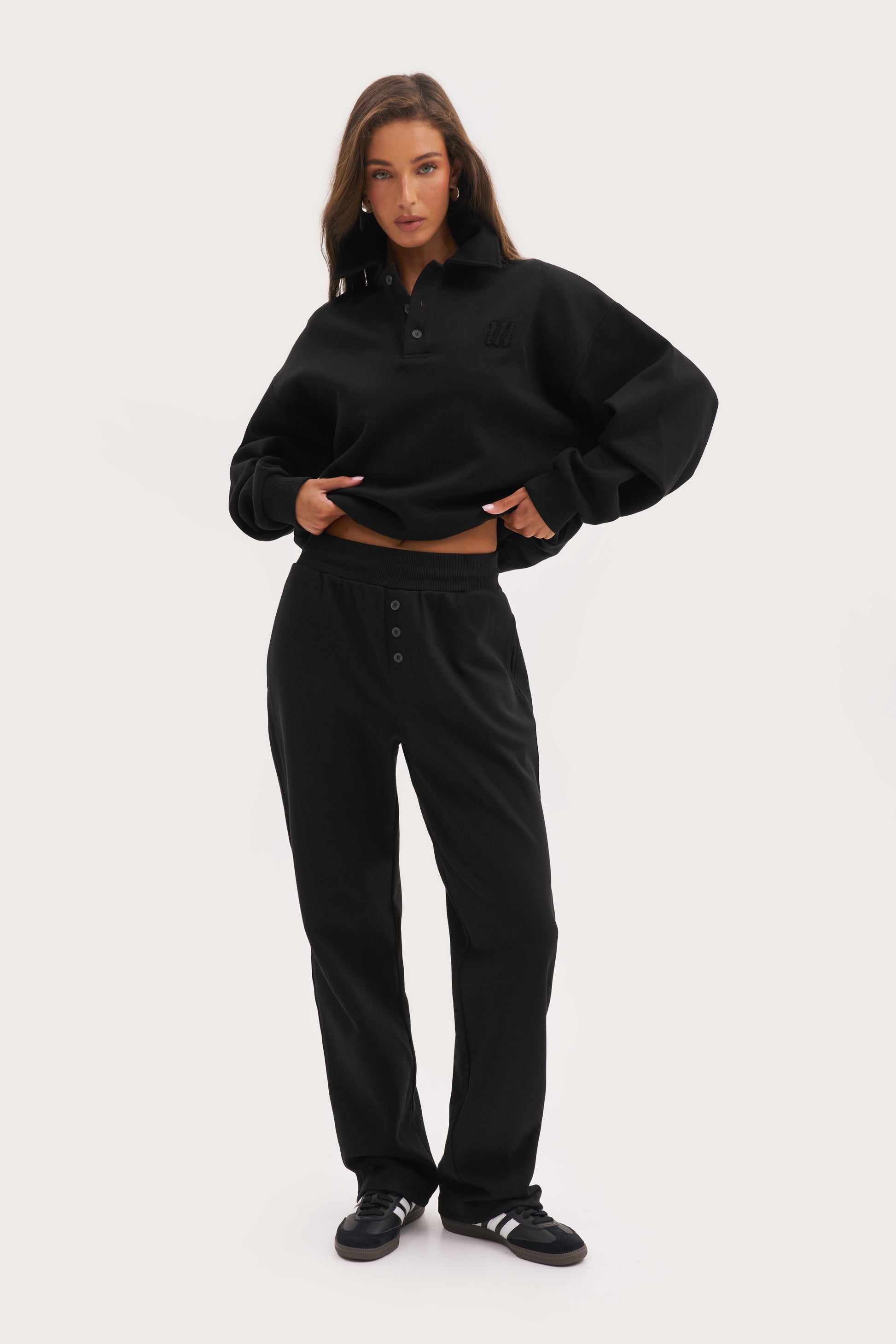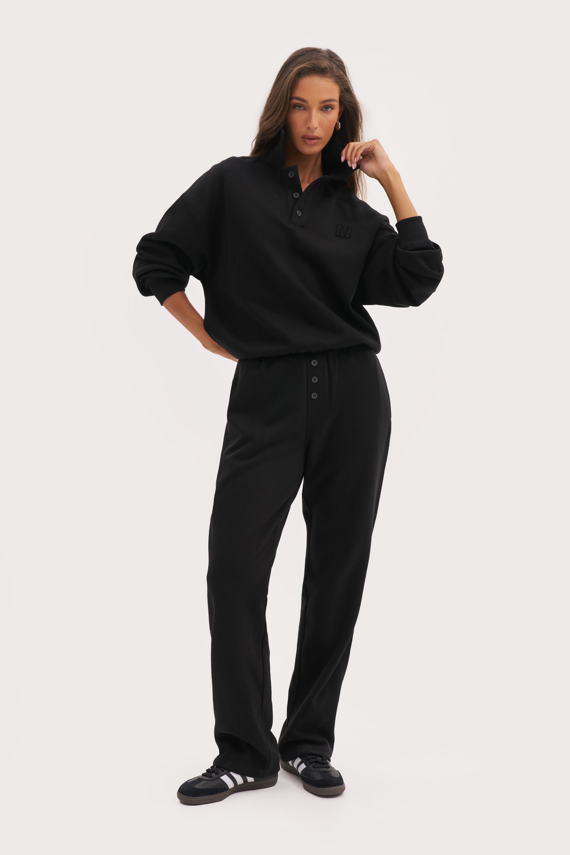 Elevate your everyday style with our washed-effect Daily Errands Straight Leg Joggers in Vintage Black. Made with soft cotton interlock jersey, these joggers feature a sleek straight leg silhouette with ribbed waistband. The internal drawcord waist, branded aglets, and embroidered detail add a touch of sophistication, while engraved buttons provide a polished finish.