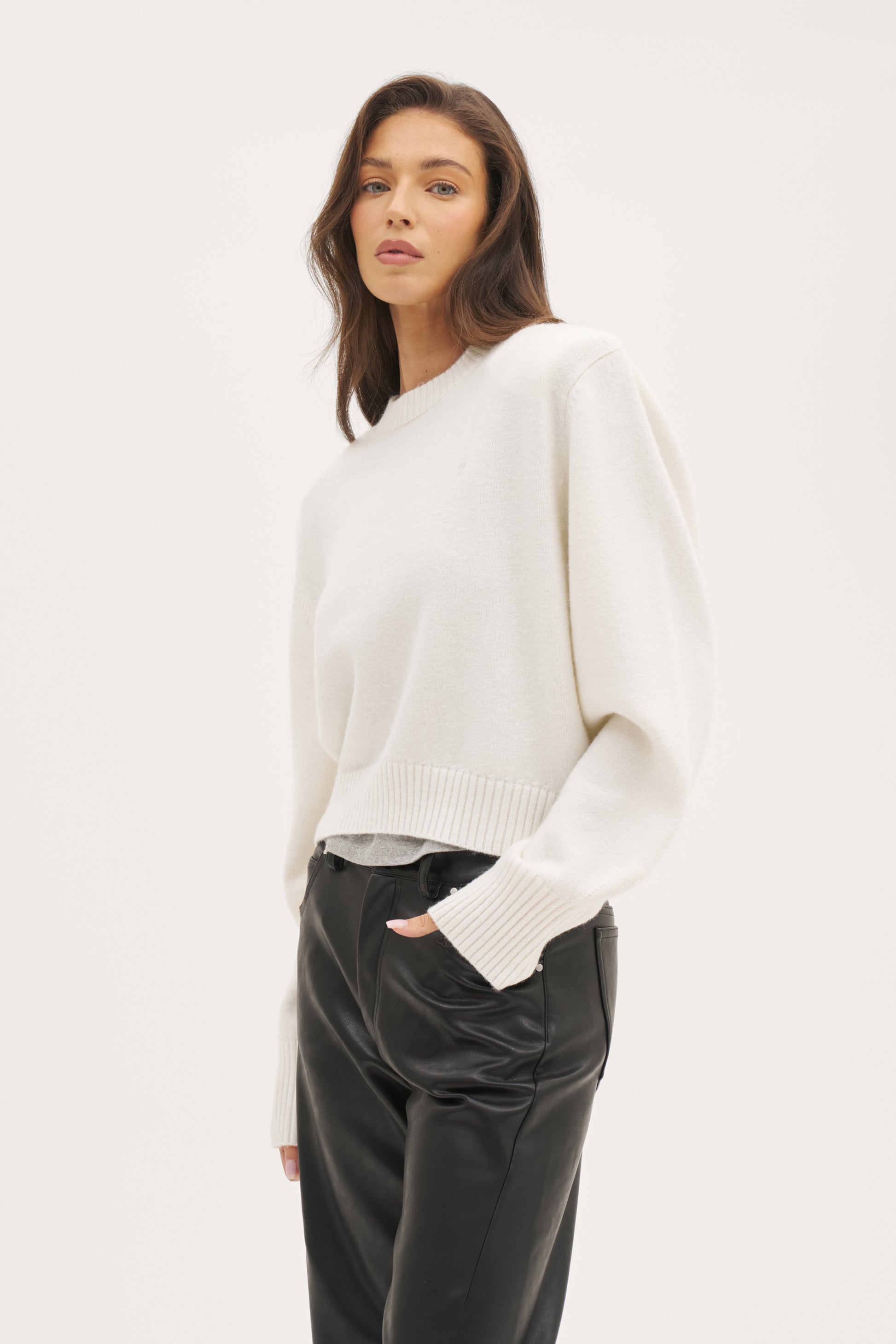 Elevate your everyday wardrobe with the Power Knitted Sweater, crafted from soft blended-yarn for exceptional comfort. The wide shoulder silhouette creates a bold structure, while relaxed sleeves and a curved hem offer effortless elegance. Removable knitted shoulder pads allow you to customise the fit to suit your preference, and the subtle Maebe embroidered branding adds a touch of understated sophistication. Perfect for layering or wearing solo, this cream sweater balances structure with ease.