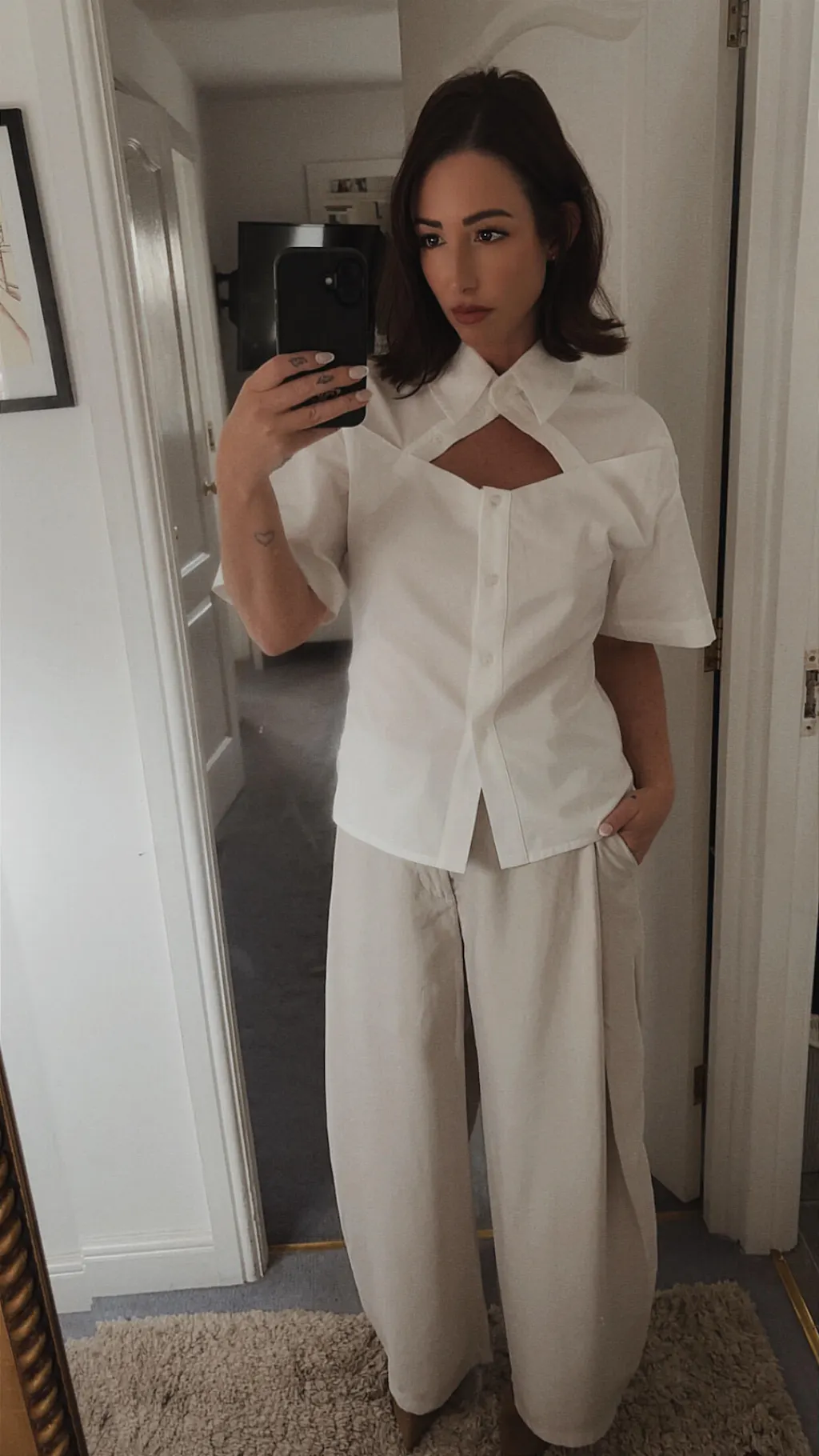 The Sasha Shirt in White combines understated elegance with contemporary design. Crafted from a soft touch blended yarn fabric, the regular yet shaped silhouette with short sleeves flatters the frame whilst maintaining a polished aesthetic. The modest cut-out front detail is perfect for effortless sophistication while the discreet embroidered branding to the back adds a signature finish.