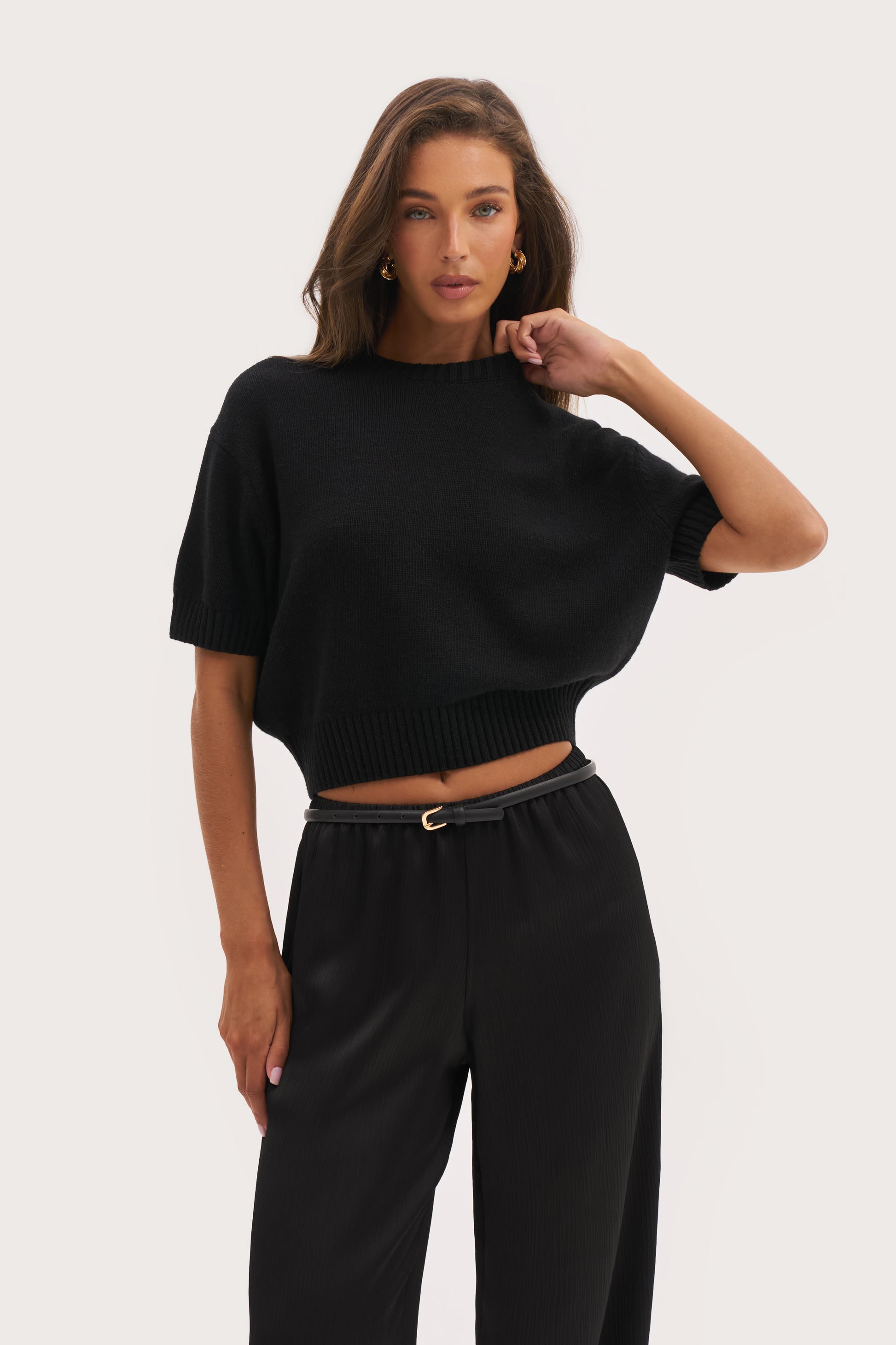 The Sofia Knit Sweater is a short-sleeved knitted sweatshirt that juxtaposes both a relaxed and a smart look. The super soft yarns, draped silhouette and cinched waistband makes it the ultimate comfy piece yet elevated piece.
