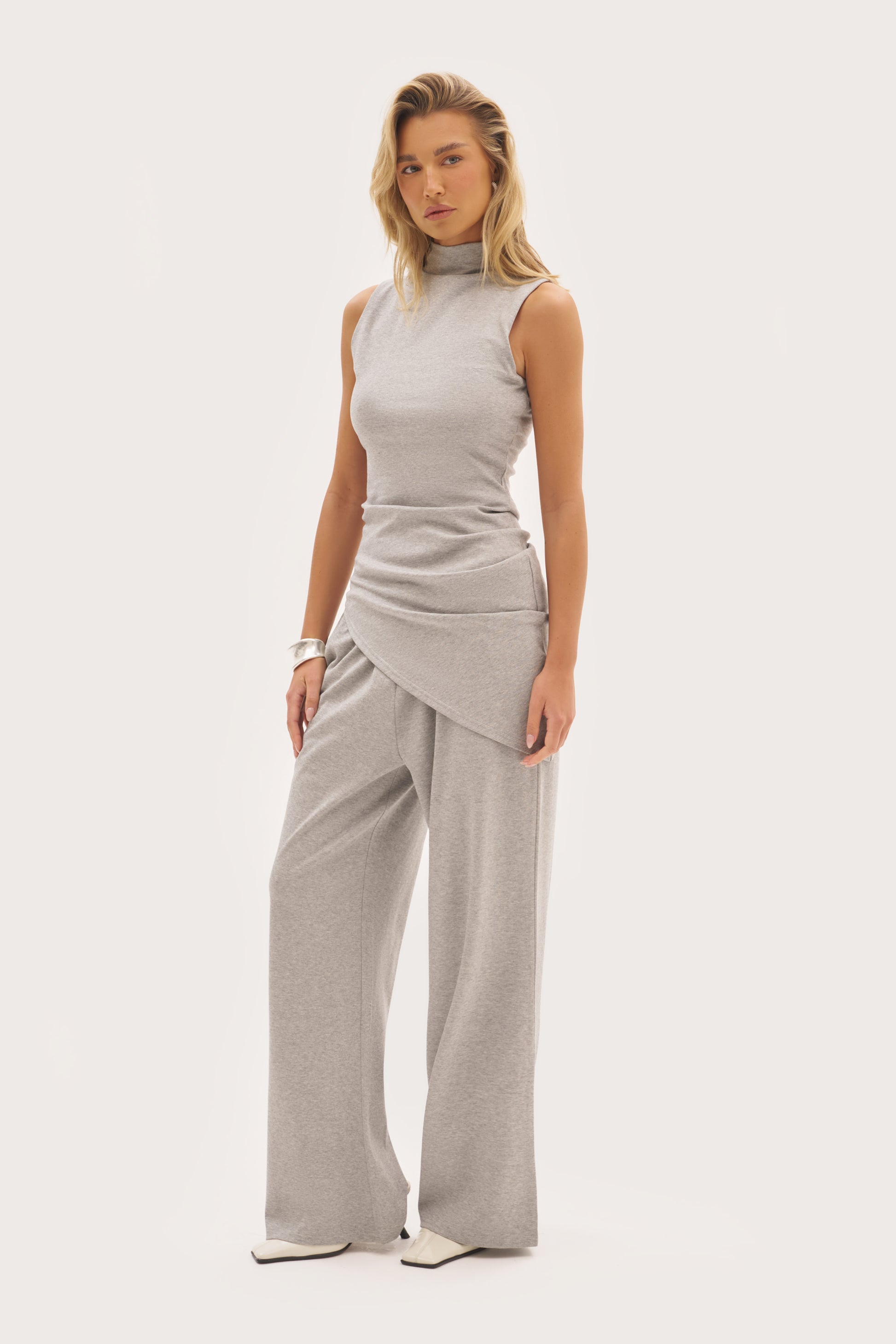 The Sora Jersey High Neck Top in Grey combines understated elegance with thoughtful design details. Crafted from a soft jersey material, this piece features a high mock neck and drape neck detailing that moves with you. Customisable gathering allows you to create natural ruching for a personalised silhouette, whilst dropped arm holes offer a relaxed, contemporary fit. A subtle tonal embroidered logo adds a refined finishing touch. Perfect for layering or wearing alone, this versatile grey top brings effortless sophistication to your everyday wardrobe.
